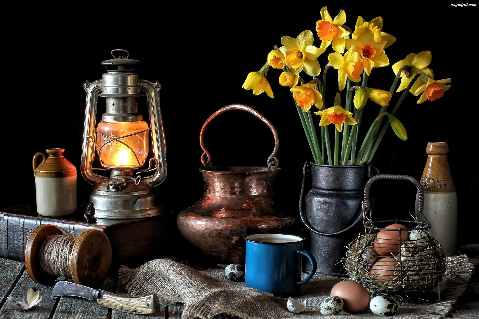 Naczynia, Bukiet, Lampa, Vintage, Kamionki