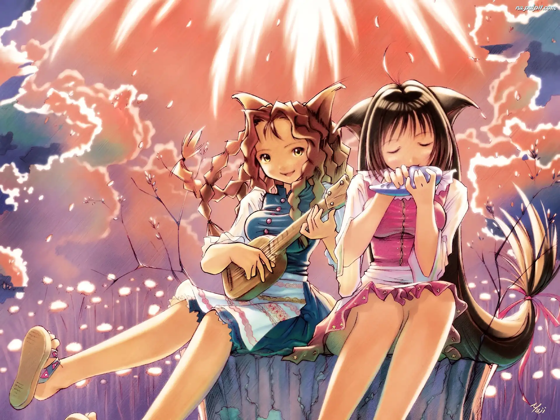 różowe włosy, Nagko, sukienka instrumenty, Nagko, dziewczyny strój w kwiaty, Nagko, warkocze zielone włosy, Nagko, sukienka liście, Nagko, świnka