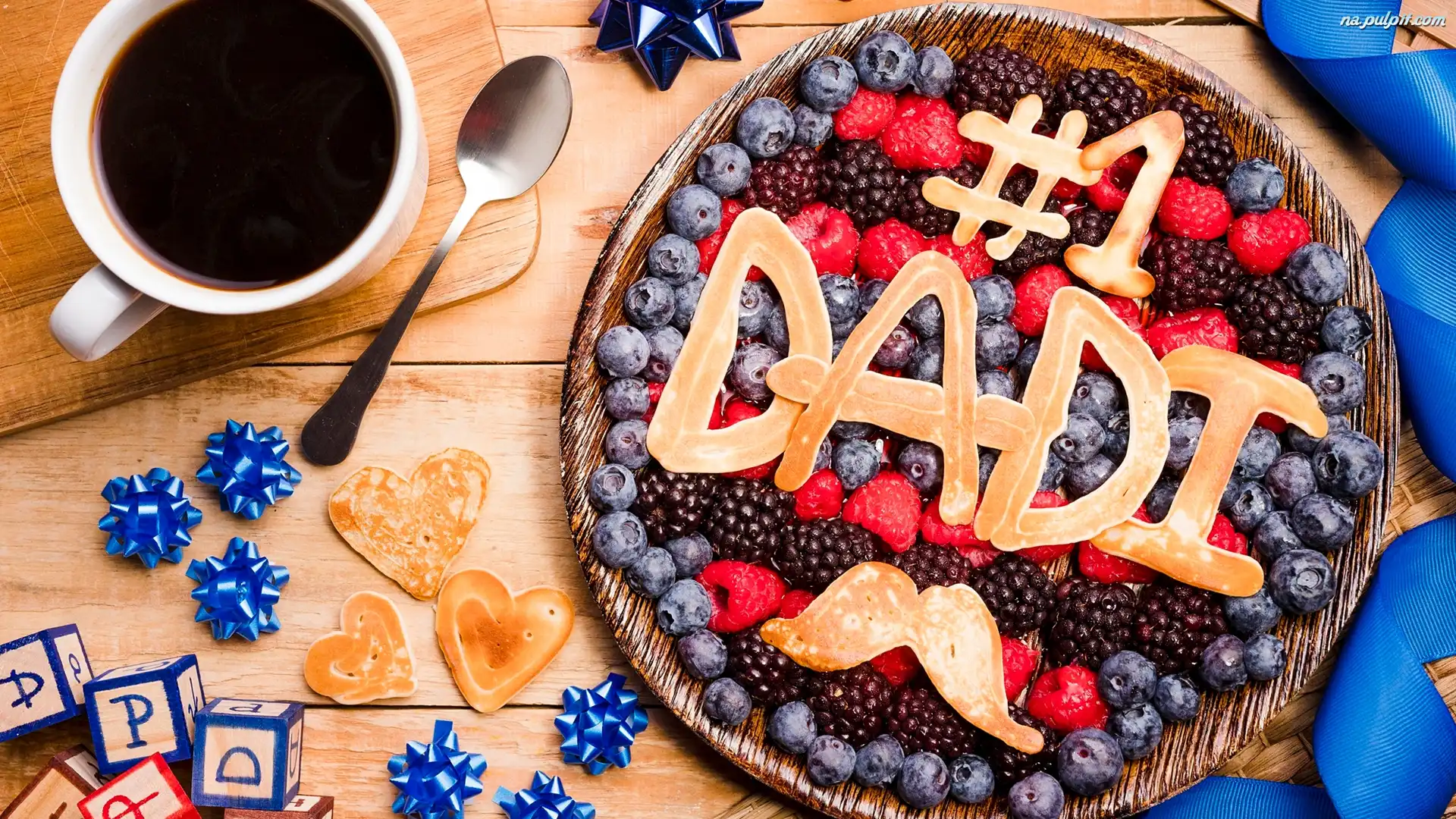 Deski, Naleśniki, Łyżeczka, Talerz, Owoce, Dzień Ojca, Kawa