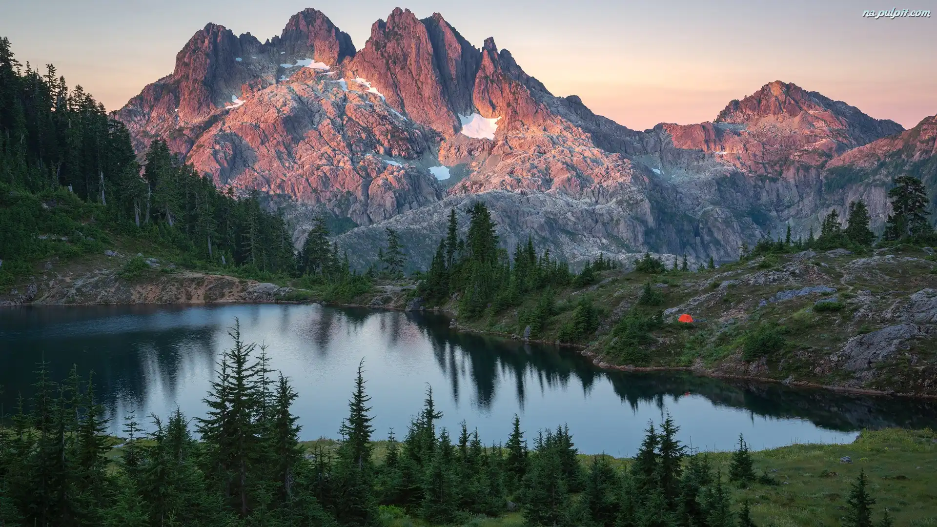Namiot, Drzewa, Jezioro, Góry, Pomarańczowy Na Pulpit