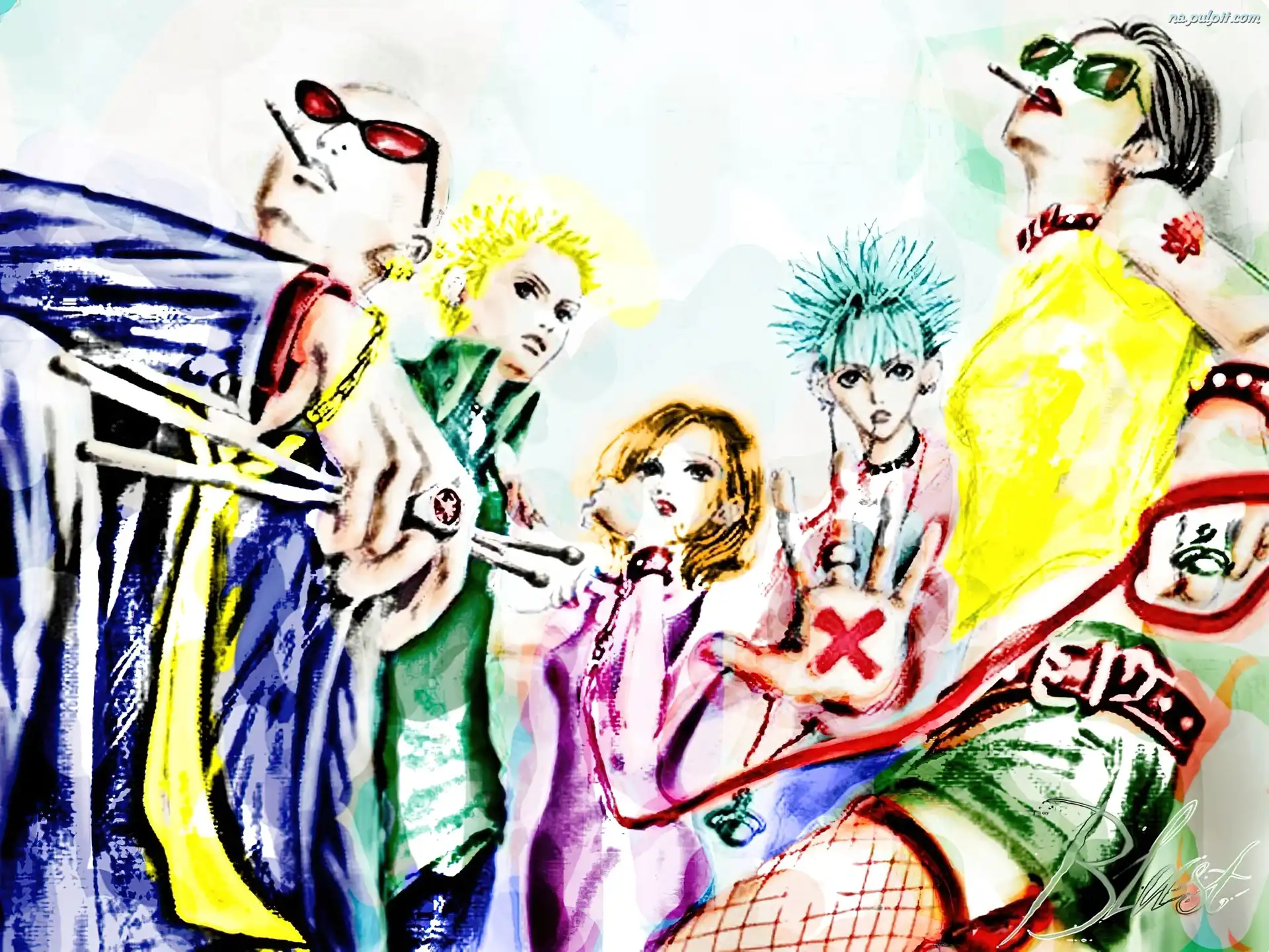 Nana, Hachi instrument, Nana, marynarka latarnia, Nana, budynek kolczyki, Nana, kolorowy tatuaż Nana, Anime pierścień, Nana, gitara rękawiczki, Nana, kozaki oczy, Nana, torebka golf, Nana, duże oczy żółte bolerko, Nana, czerwona obroża pasek, Nana, czerwone włosy dziewczyny, Nana, anime ciemne włosy, Nana, profil twarzy pałeczki, Nana, okulary