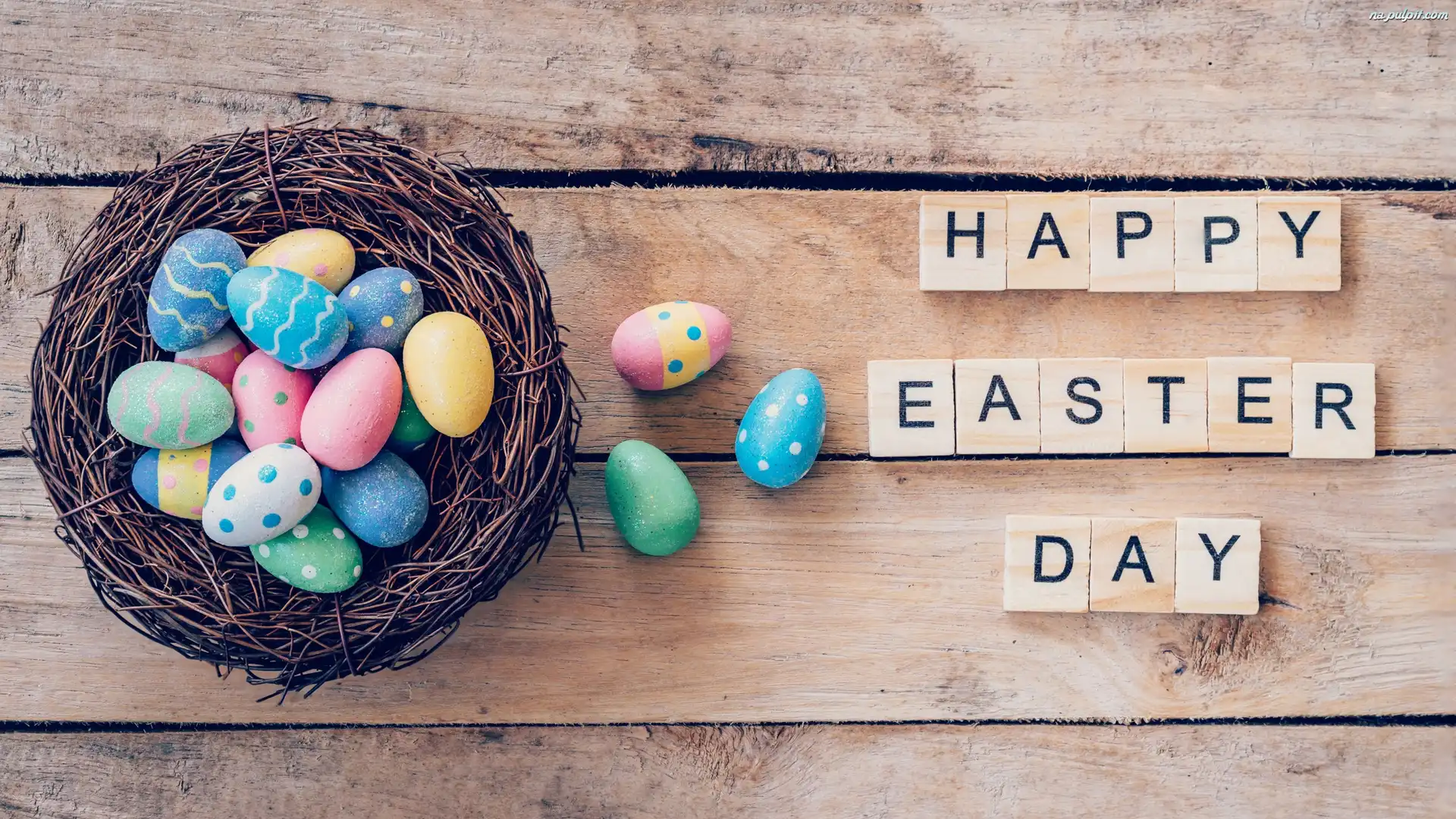 Deski, Gniazdo, Happy Easter Day, Życzenia, Pisanki, Wielkanoc, Napis Na Pulpit