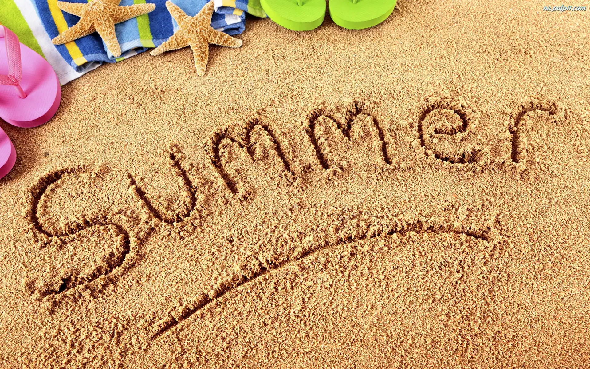 Piasek, Muszelki, Rozgwiazdy, Napis, Summer, Lato, Japonki Na Pulpit