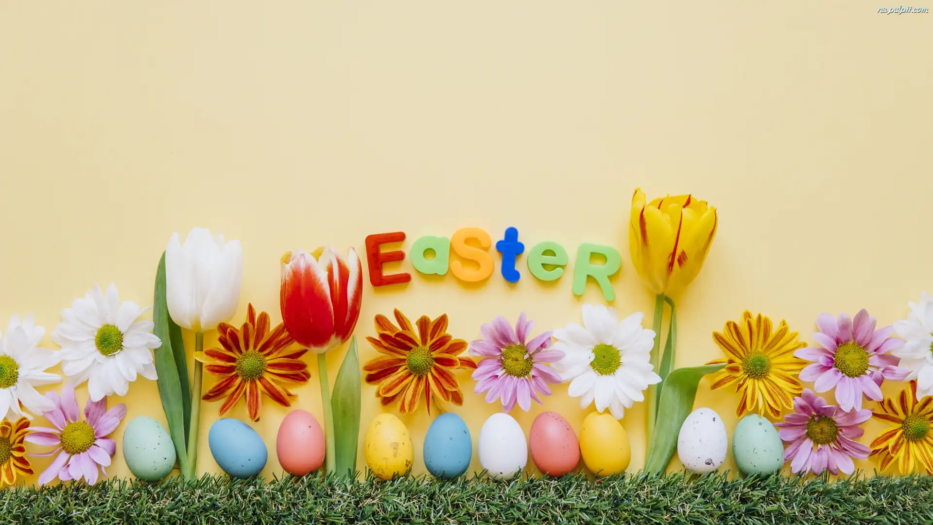 Trawa, Napis, Pisanki, Tulipany, Kwiaty, Wielkanoc, Margerytki Na Pulpit