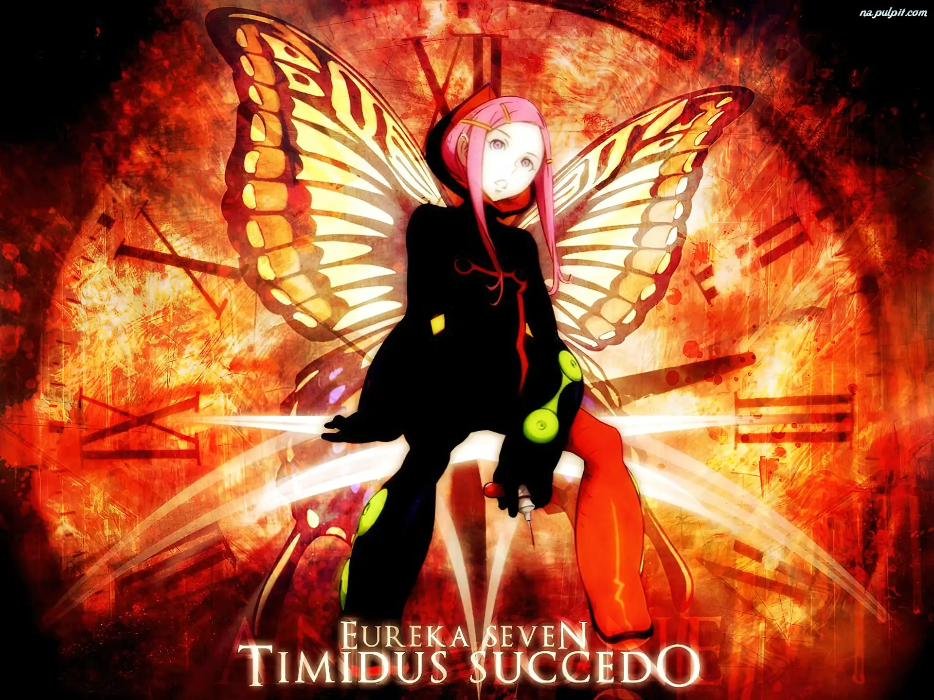 dziewczyna, napisy, zegar, skrzydła, Eureka 7, motyl