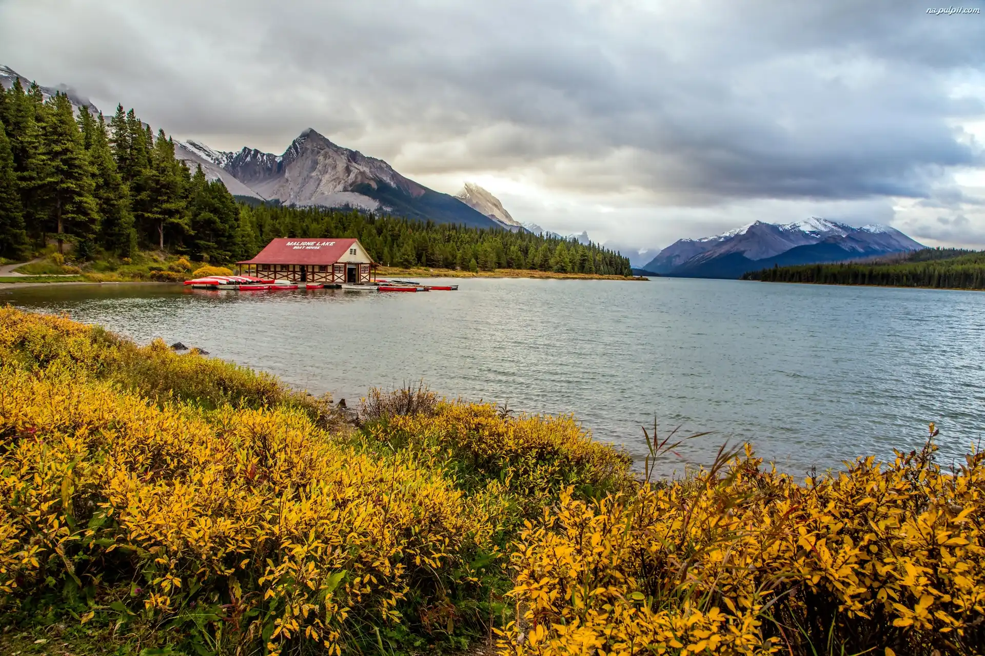 Przystań, Park Narodowy, Jasper, Alberta, Łódki, Jesień, Góry, Jezioro Maligne, Lasy Na Pulpit