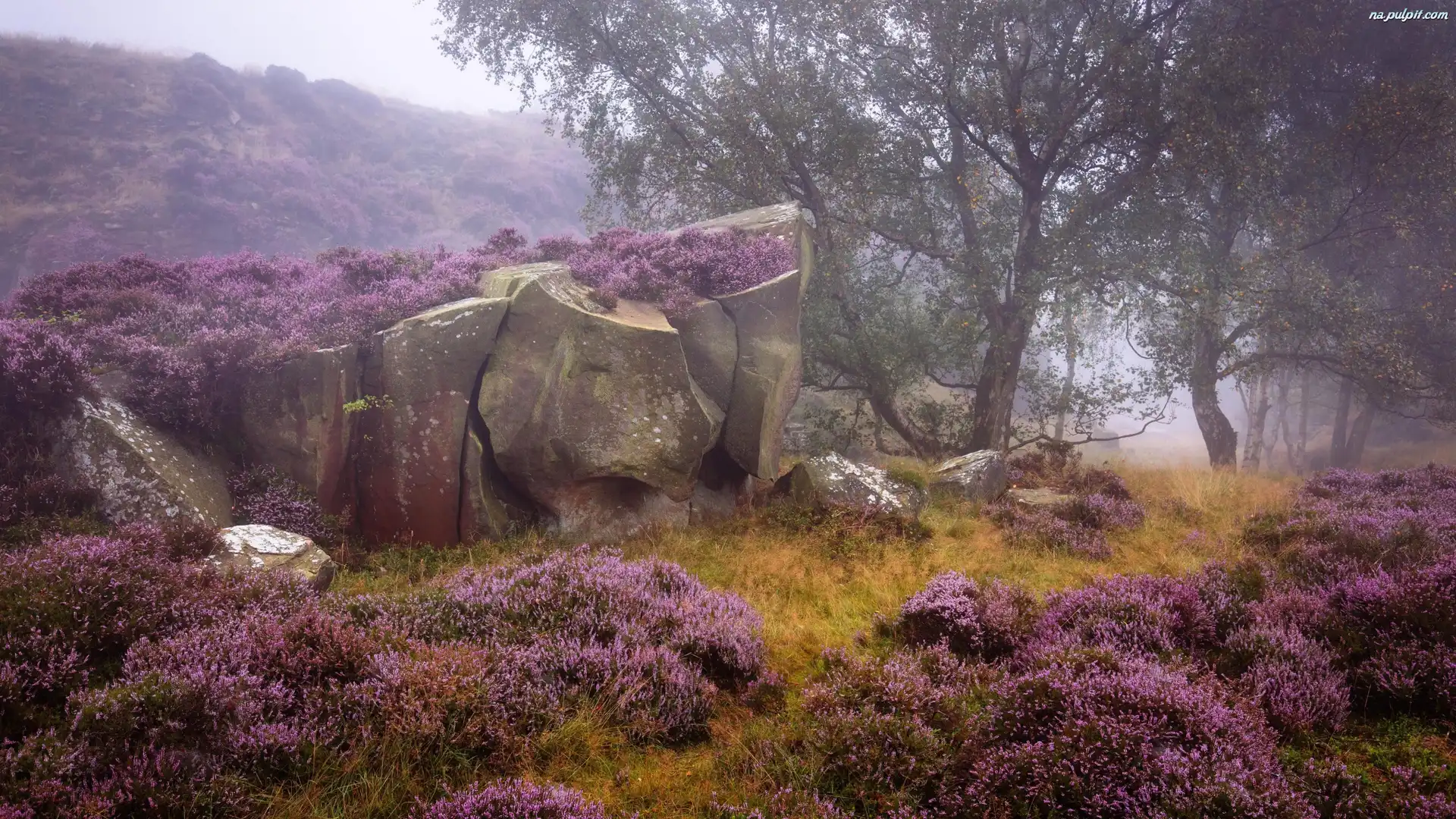 Wrzos, Park Narodowy Peak District, Jesień, Drzewa, Skały, Mgła, Anglia, Wrzosowisko Na Pulpit