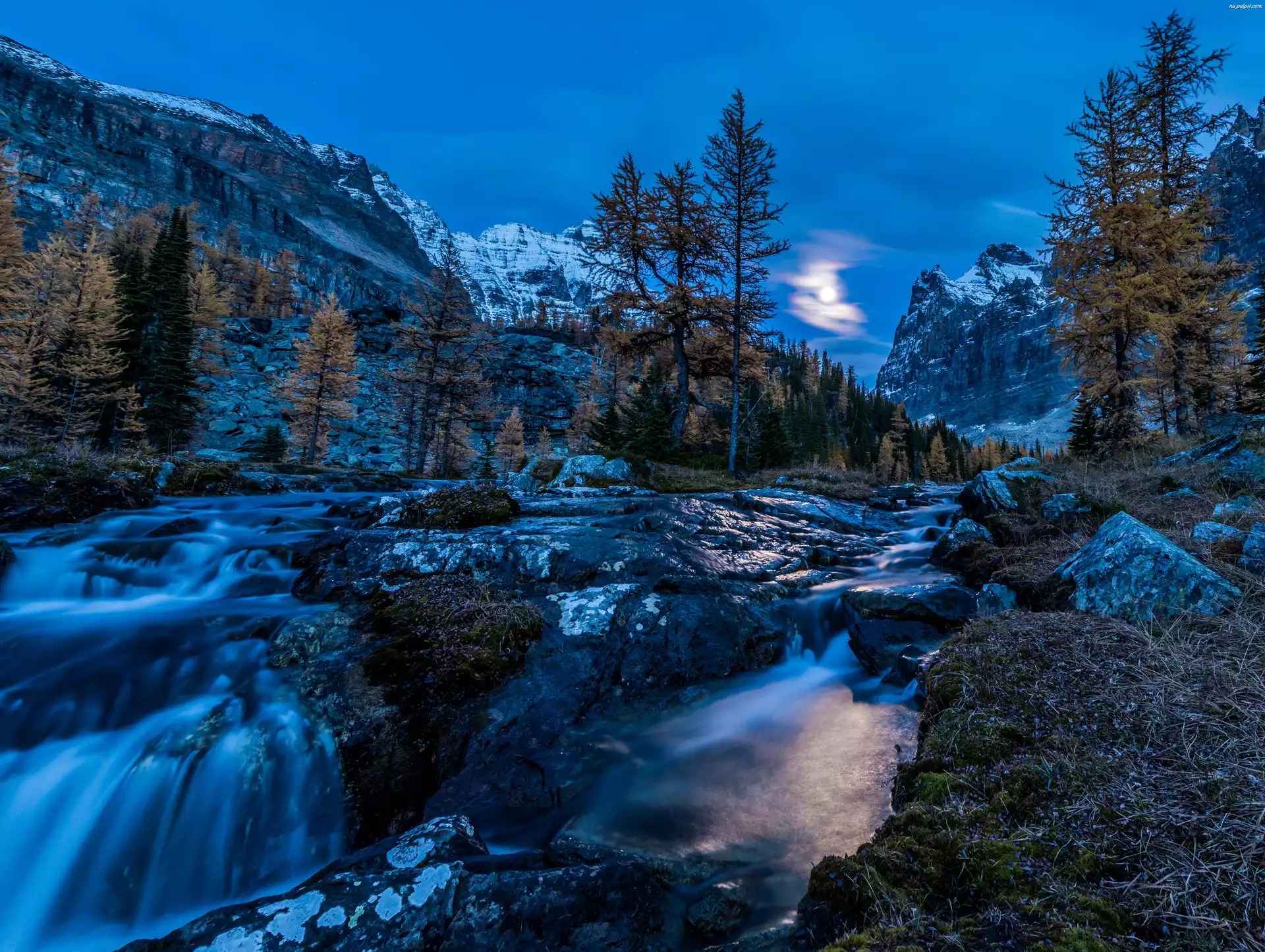 Park Narodowy Yoho, Świt, Drzewa, Potok, Kanada, Góry