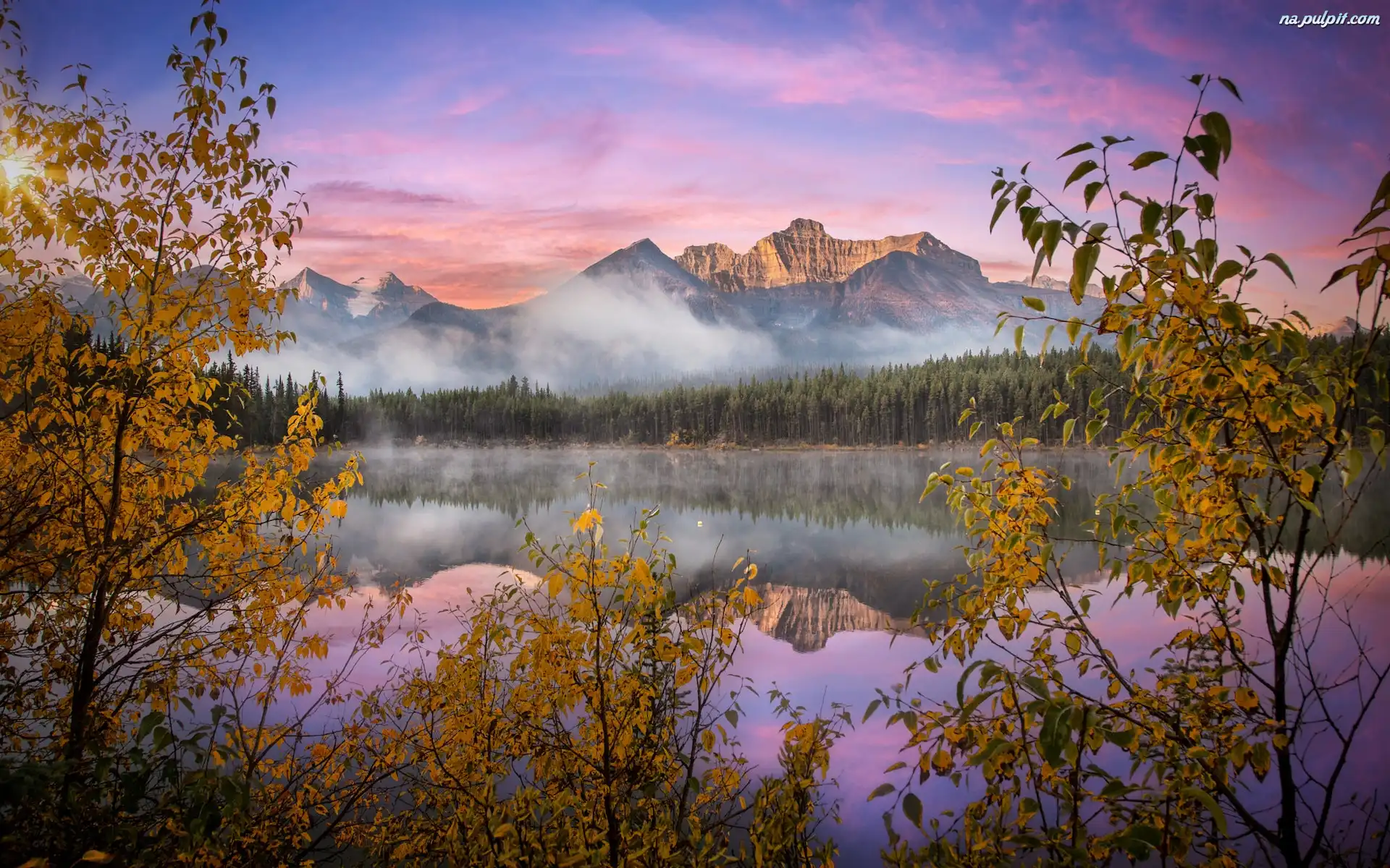 Jesień, Drzewa, Park Narodowy Banff, Canadian Rockies, Jezioro, Góry, Kanada, Mgła, Herbert Lake Na Pulpit |