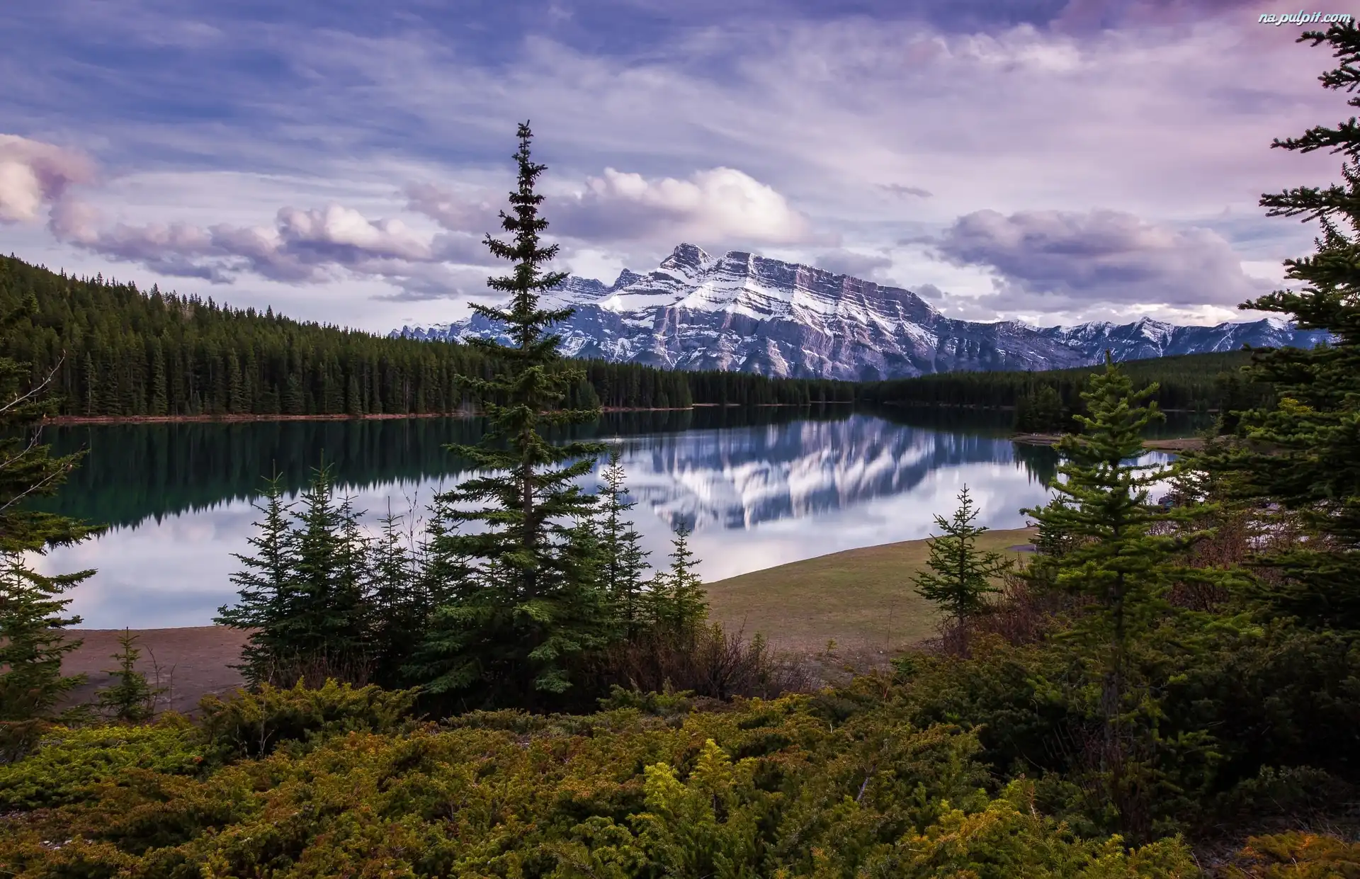 Świerki, Park Narodowy Banff, Lasy, Góry, Jezioro Vermilion, Kanada, Szczyt Mount Rundle Na Pulpit |