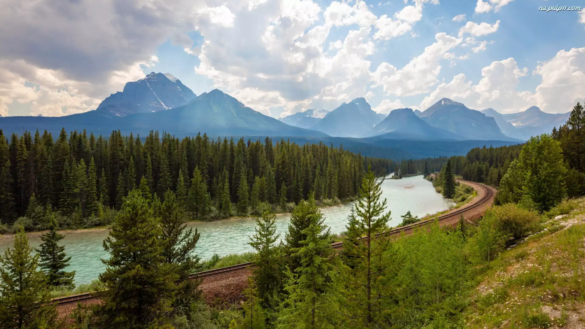 Alberta, Bow River, Kanada, Rzeka, Las, Tory, Park Narodowy Banff, Góry Skaliste, Drzewa, Chmury Na Pulpit |