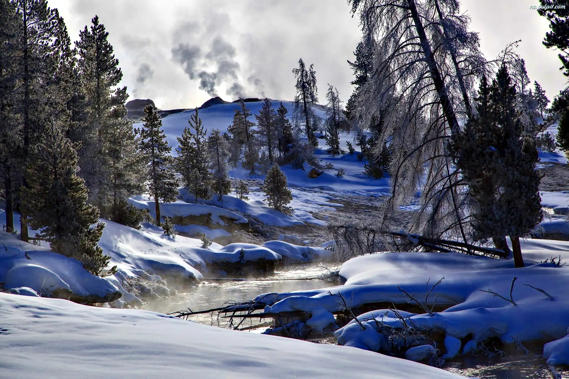 Stan Wyoming, Zima, Drzewa, Park Narodowy Yellowstone, Stany Zjednoczone, Rzeka Firehole River Na Pulpit |