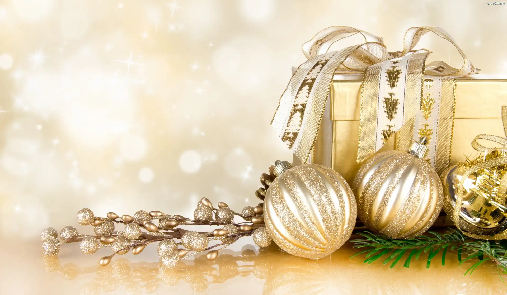 Boże Narodzenie, Złote, Świąteczna, Gałązki, Bombki, Prezent, Kompozycja