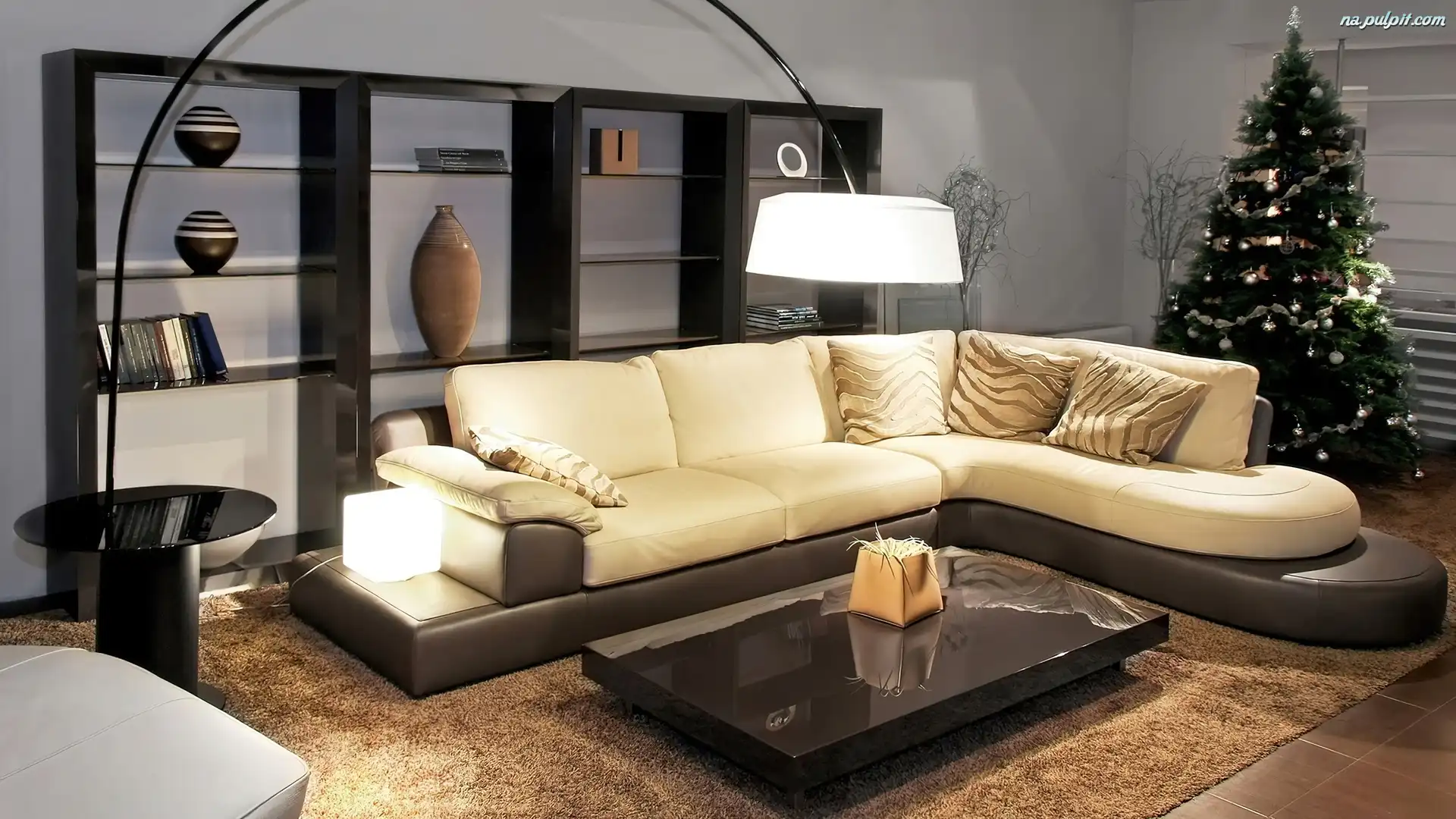Lampa, Narożnik, Wazony, Stolik, Choinka, Pokój, Regał
