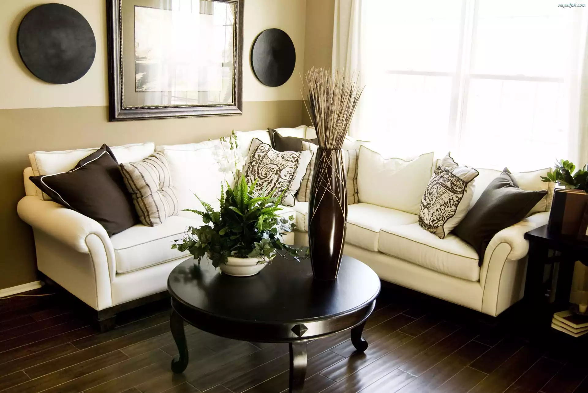 Narożnik, Wazony, Poduszki, Stolik, Pokój, Kwiaty
