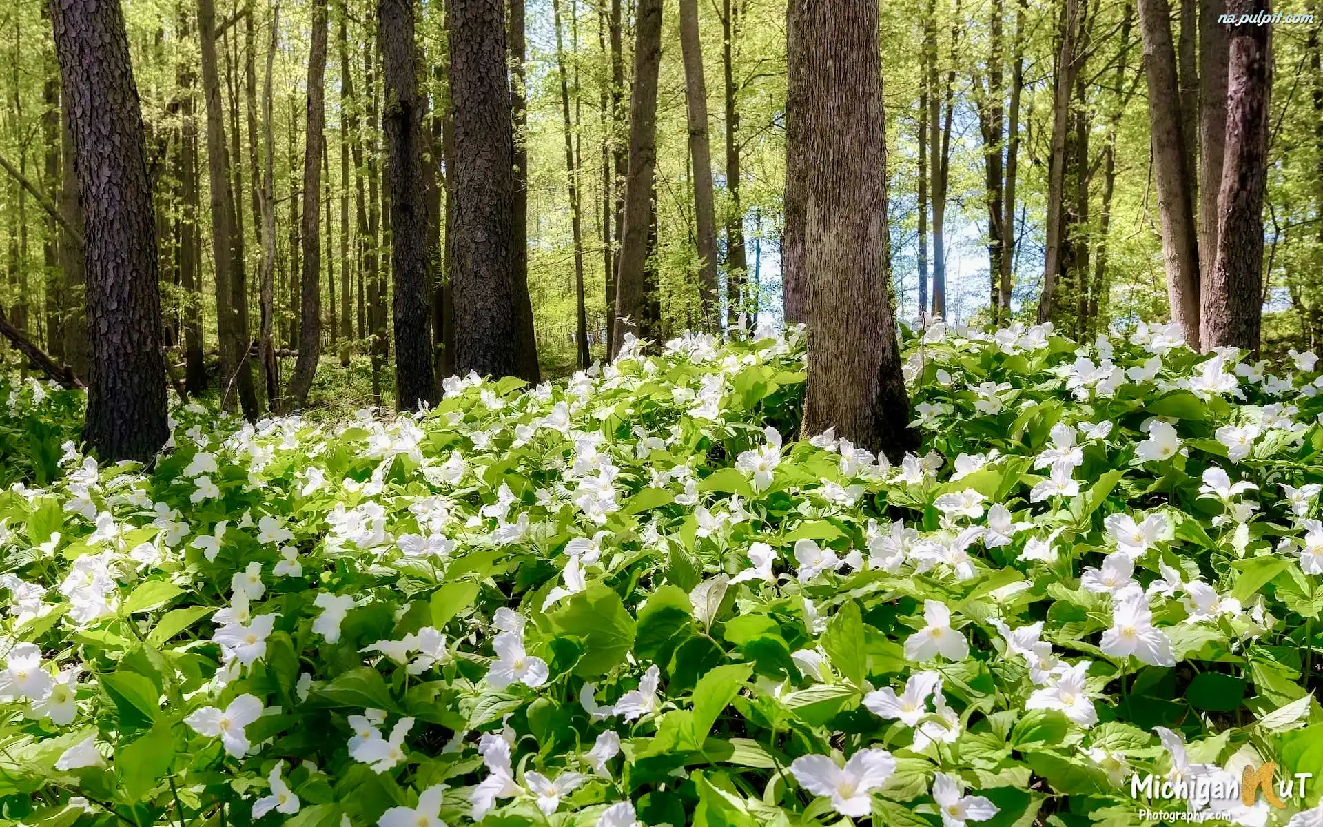 Kwiaty, Drzewa, Trójlisty wielkokwiatowe, Las, Stany Zjednoczone, Michigan, Manistee National Forest, Białe Na Pulpit |