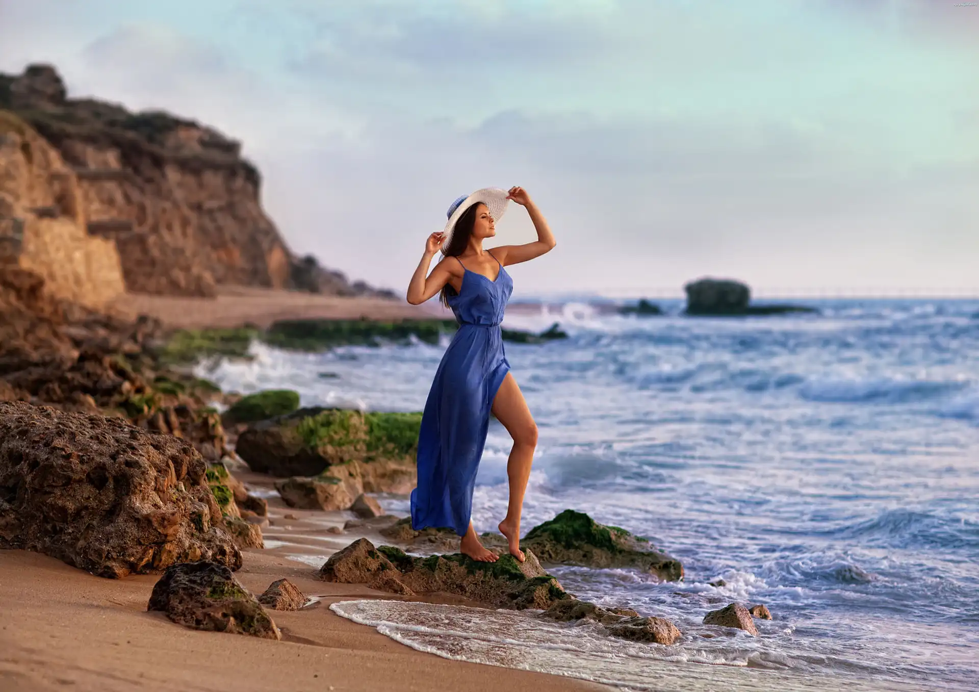 Niebieska, Morze, Skały, Sukienka, Kobieta, Plaża Na Pulpit
