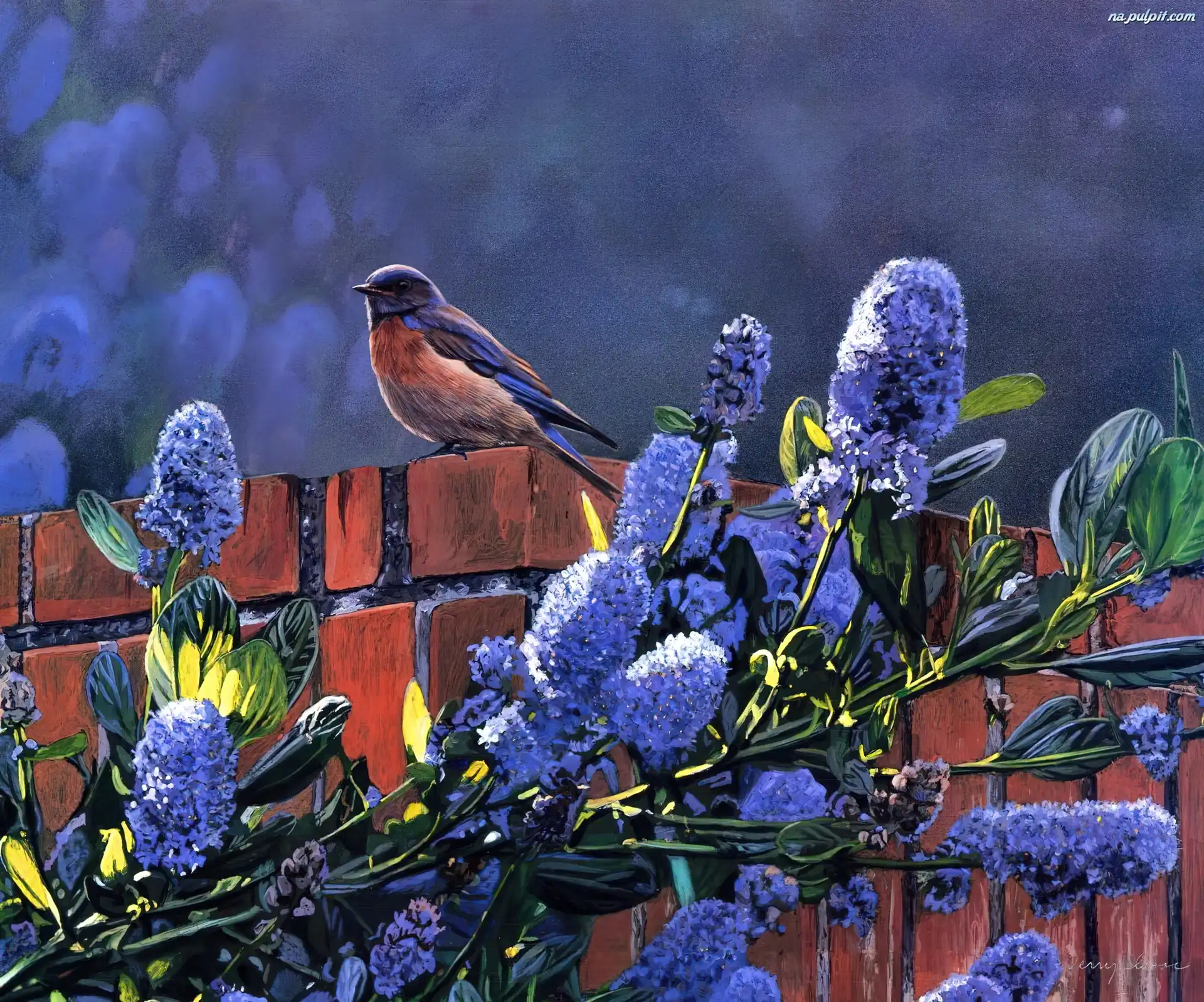 Niebieski, Liliowe, Kwiaty, Ptak, Czerwono, Mur