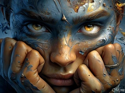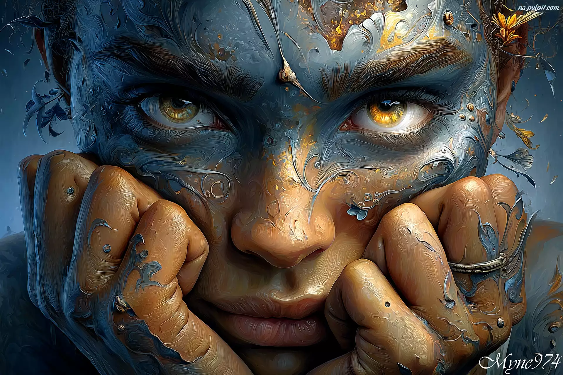 Rysunek, Dziewczyna, Dłonie, Niebieski, Spojrzenie, Grafika AI Na Pulpit