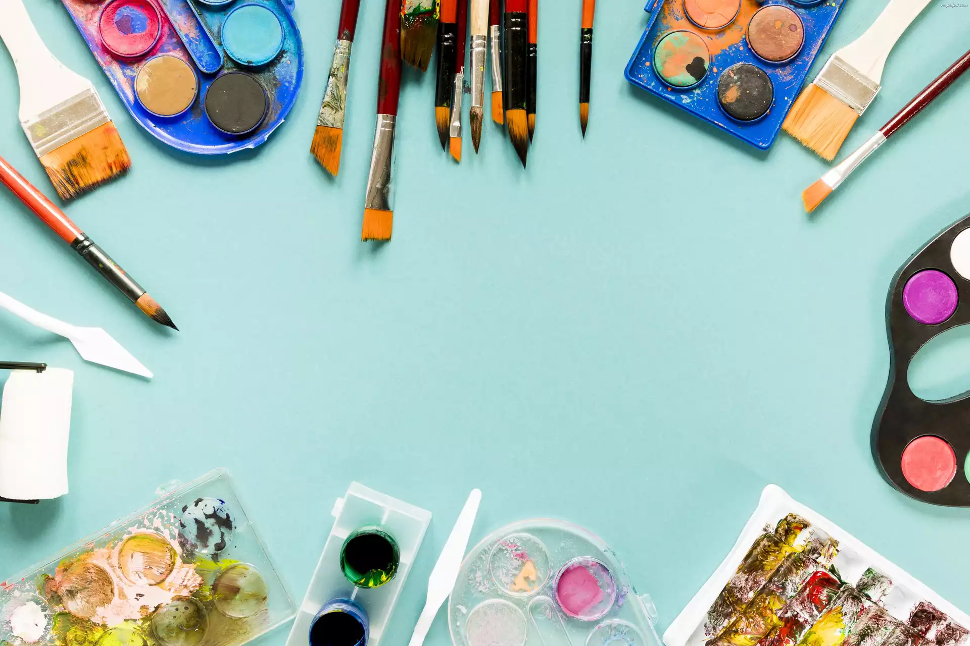 Niebieskie, Ołówki, Pędzelki, Farbki, Tło