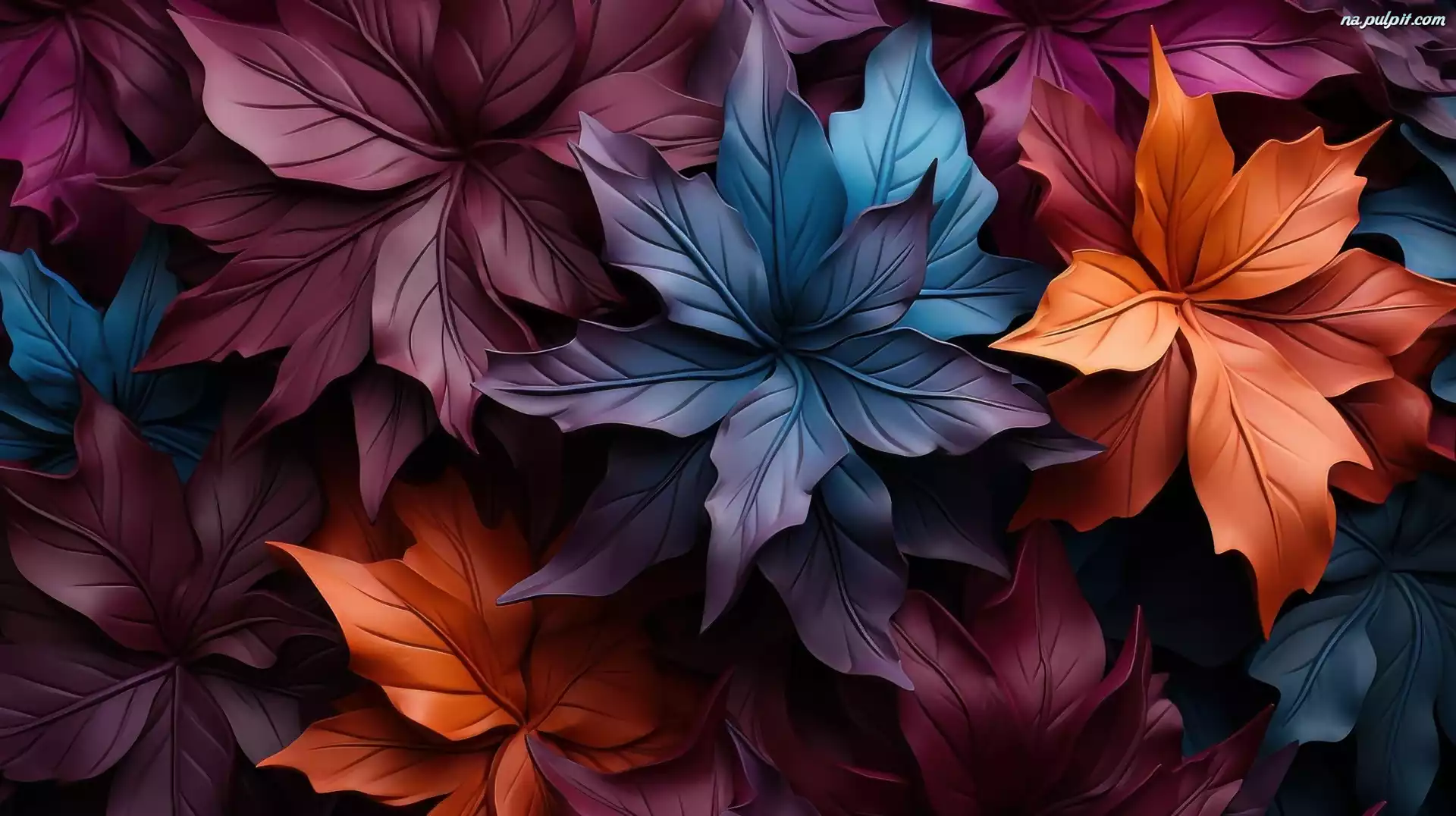 Pomarańczowe, Kolorowe, Bordowe, Niebieskie, Liście, Grafika Na Pulpit