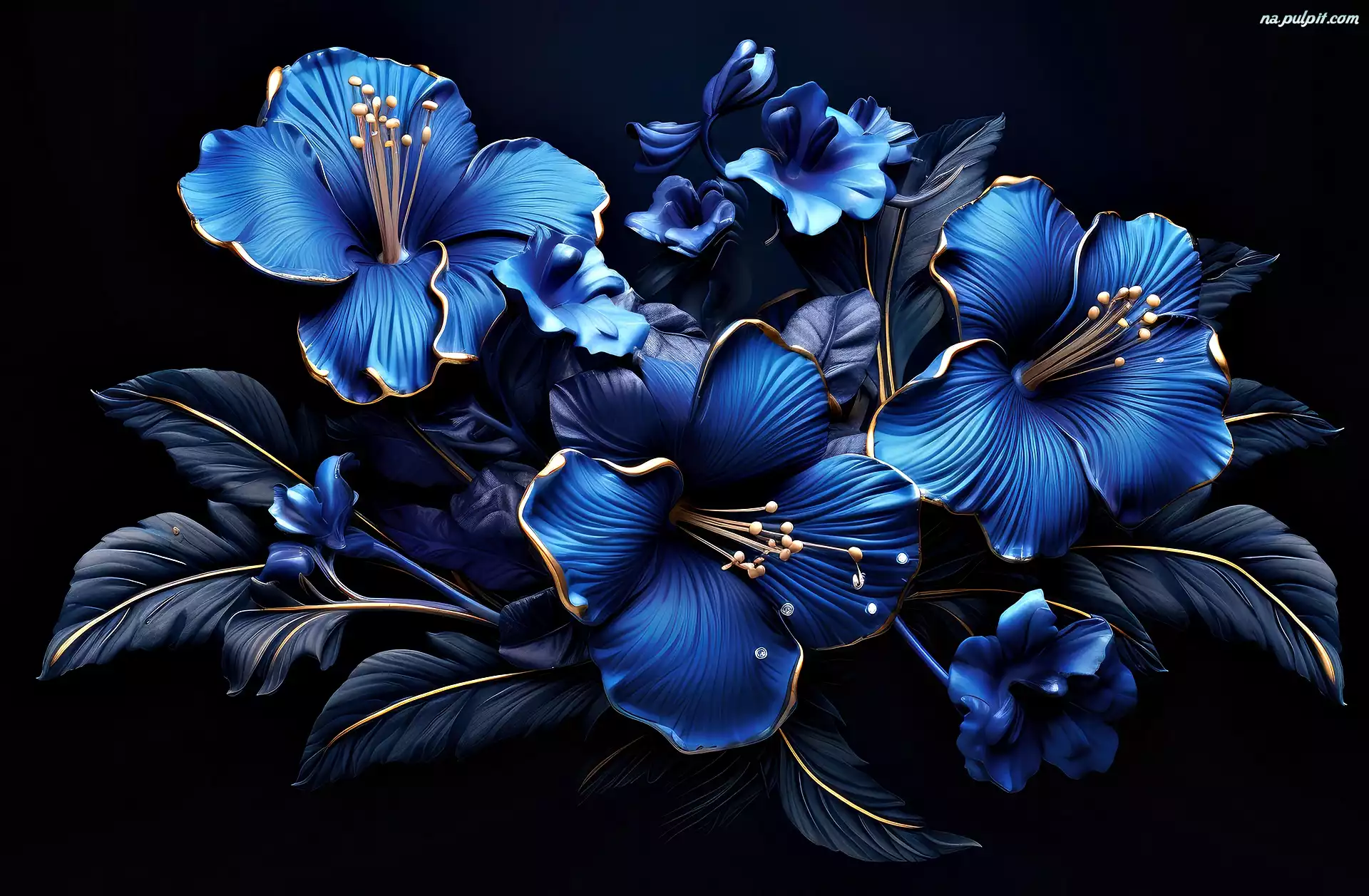 Tło, Niebieskie, Kwiaty, Grafika, Czarne