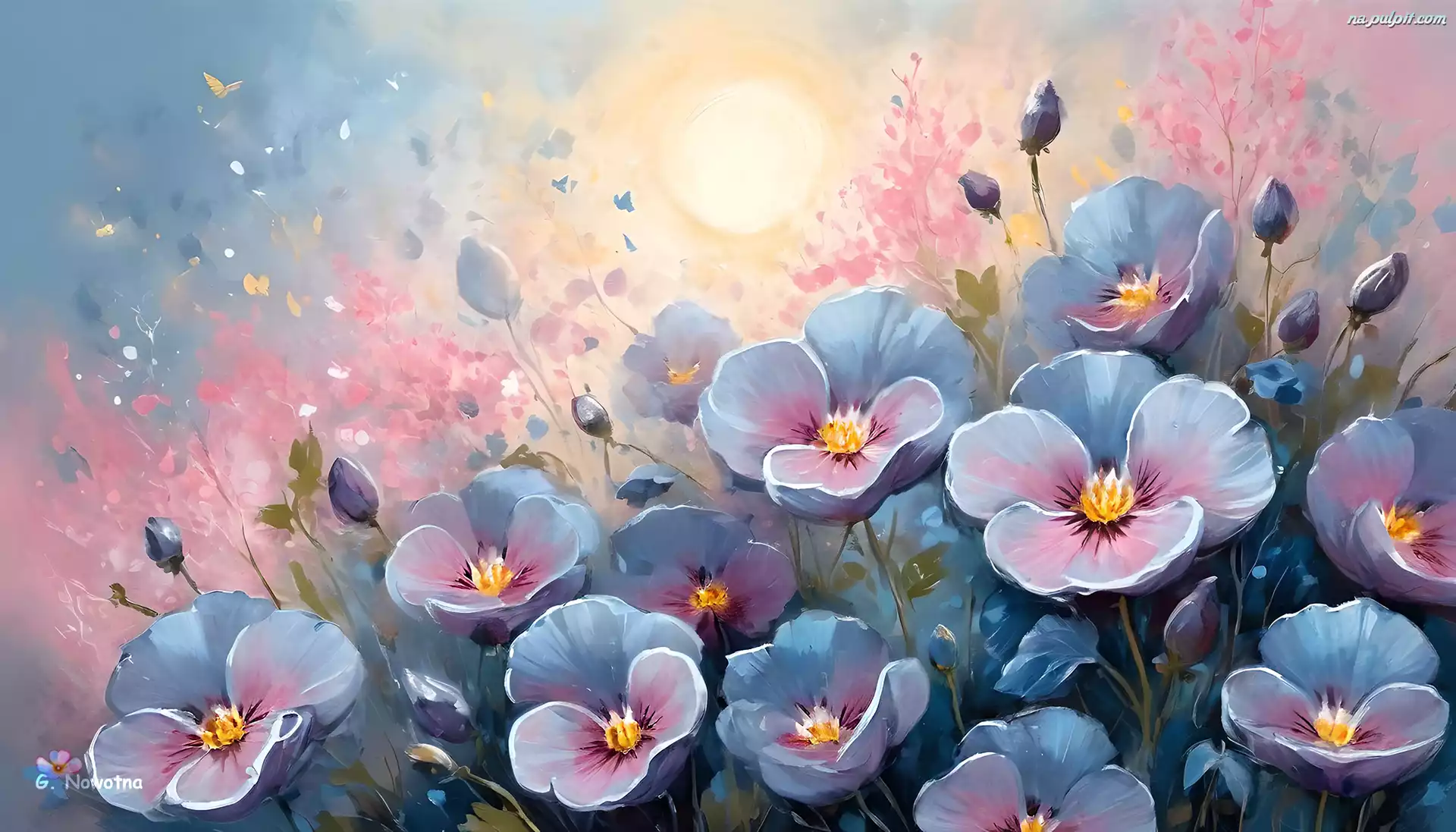 Słońce, Niebieskie, Różowe, Grafika, Kwiaty Na Pulpit