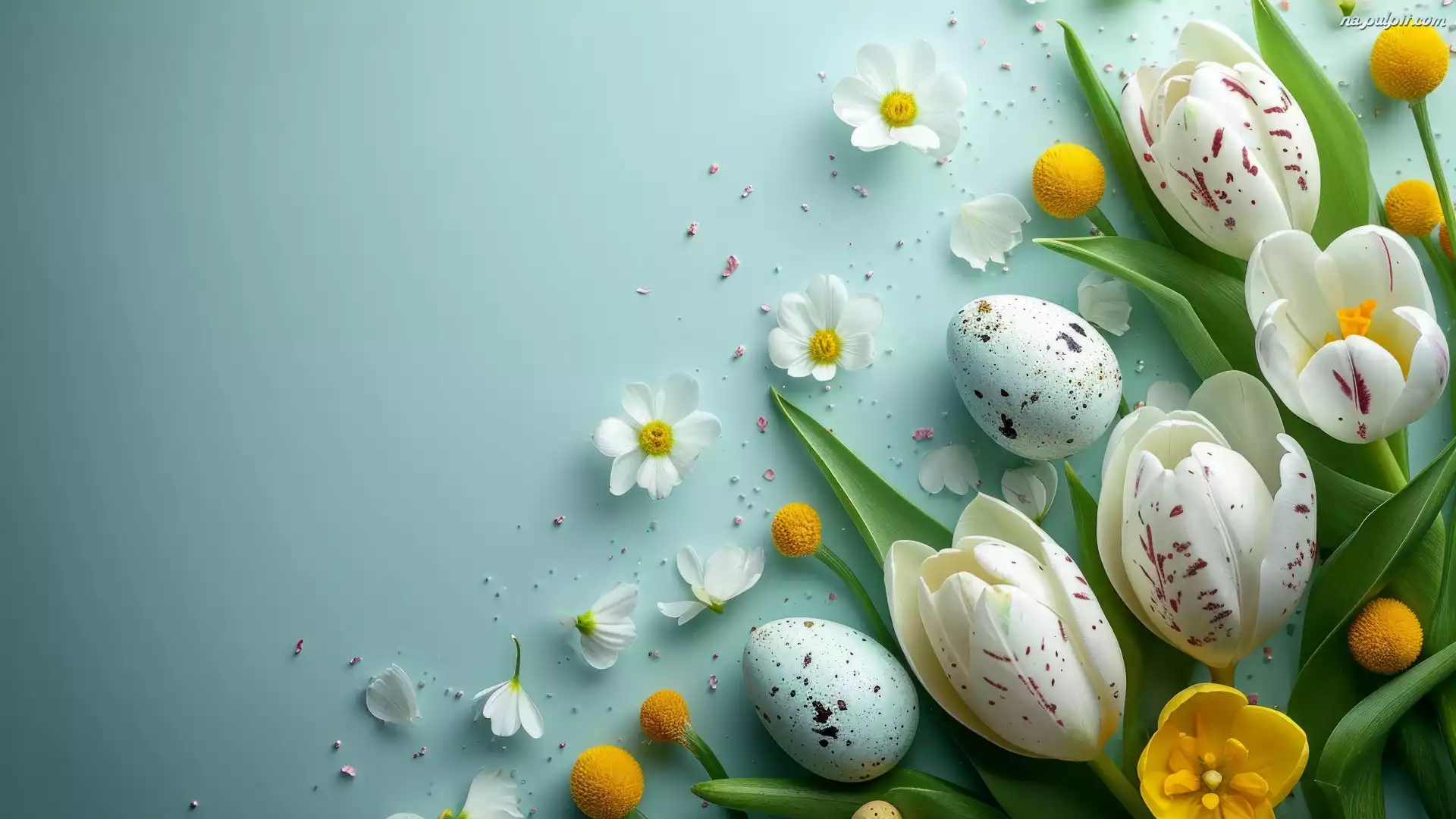 Niebieskie, Tło, Kolorowe, Białe, Żółte, Pisanki, Wielkanoc, Tulipany, Kwiaty Na Pulpit