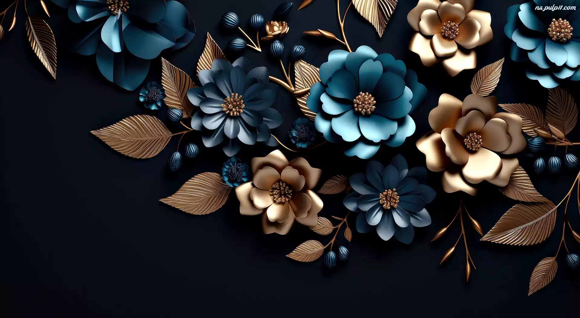 Liście, Niebieskie, Złote, Grafika, Kwiaty Na Pulpit
