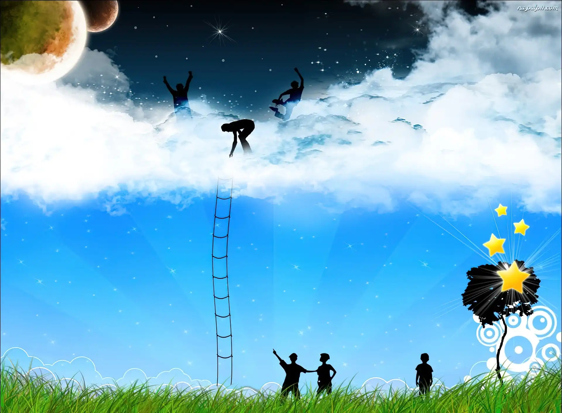 Niebo, Dzieci, Drzewo, Łąka, Drabina