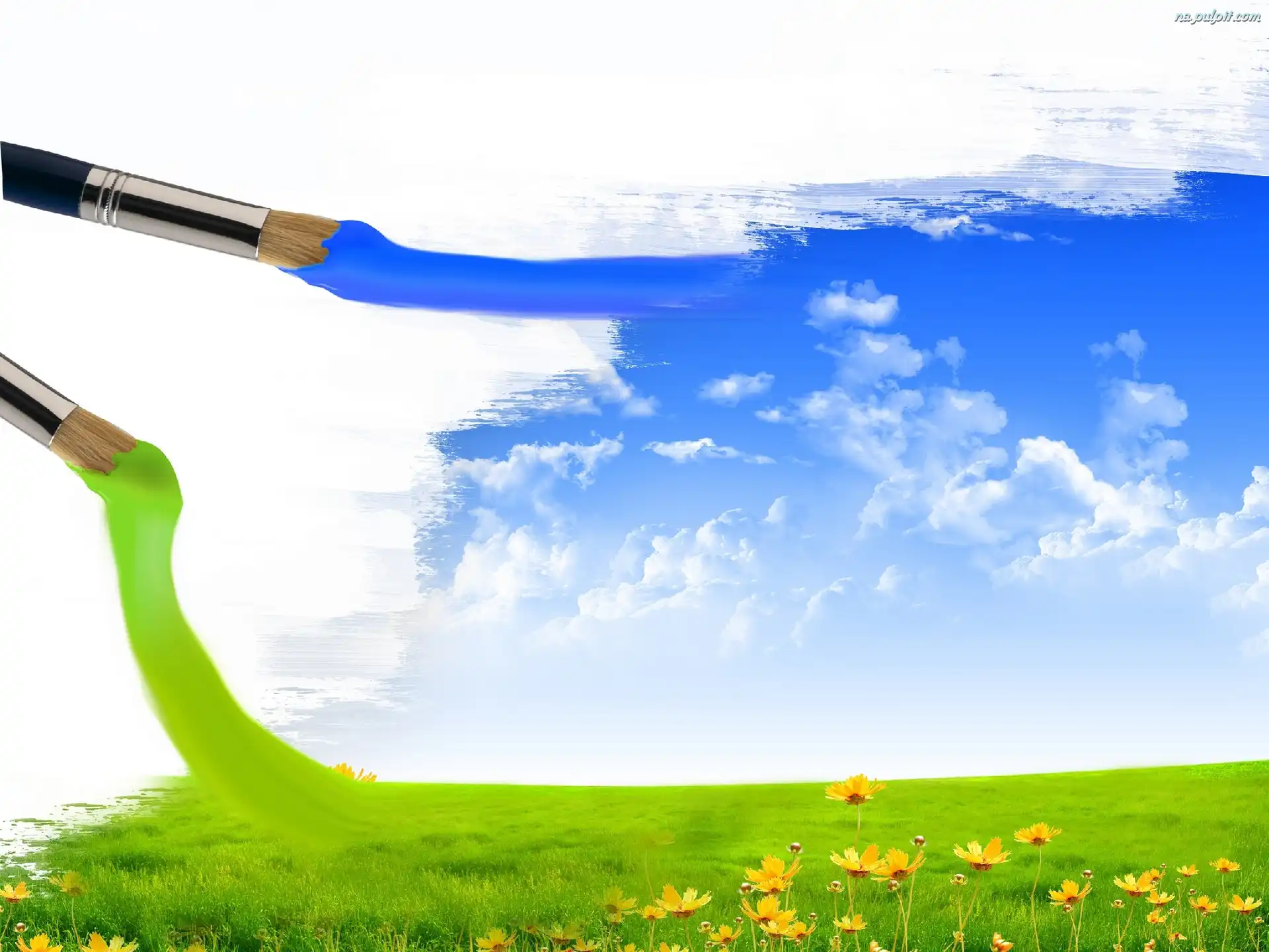 Niebo, Zielona, Łąka, Pędzle, Błękitne, Farba Na Pulpit