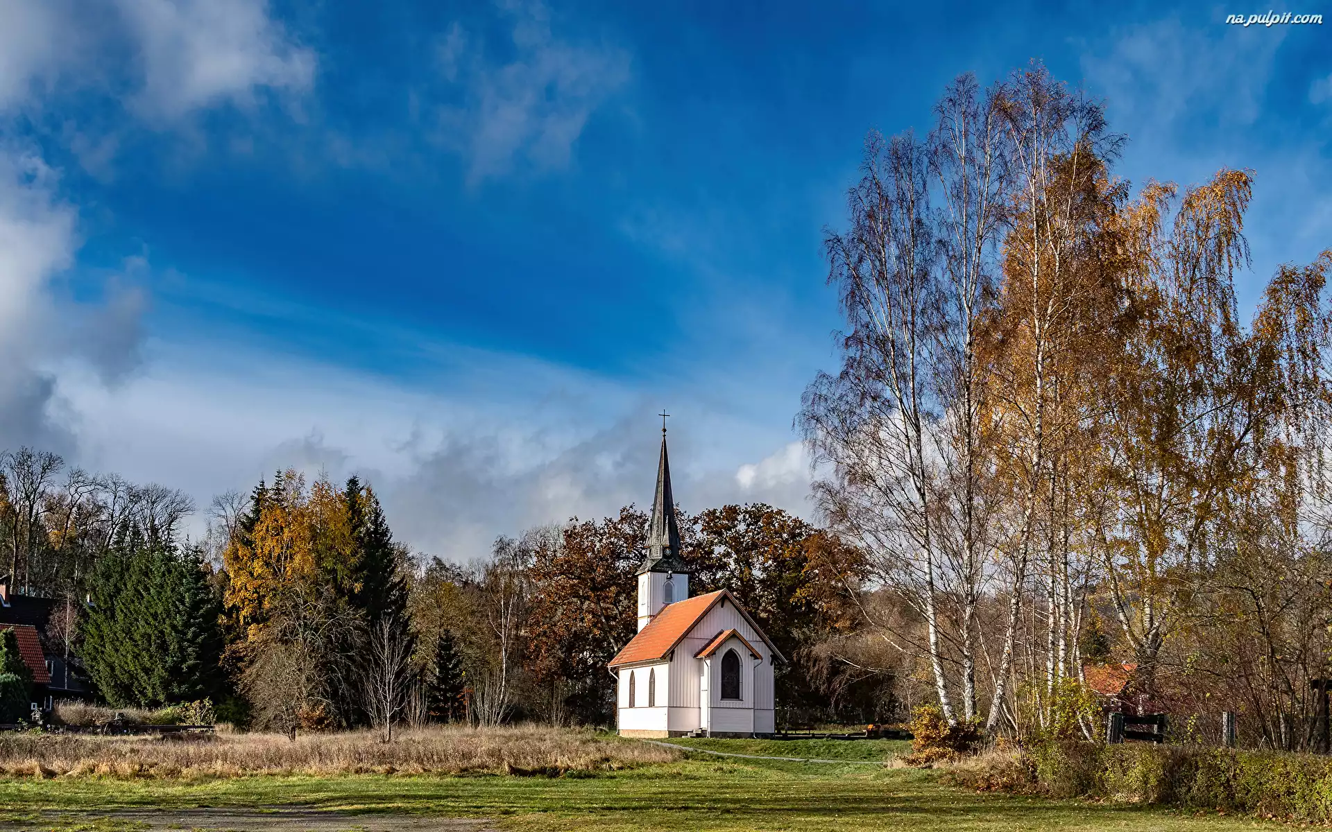 Polana, Niebo, Chmury, Kościół, Drzewa Na Pulpit
