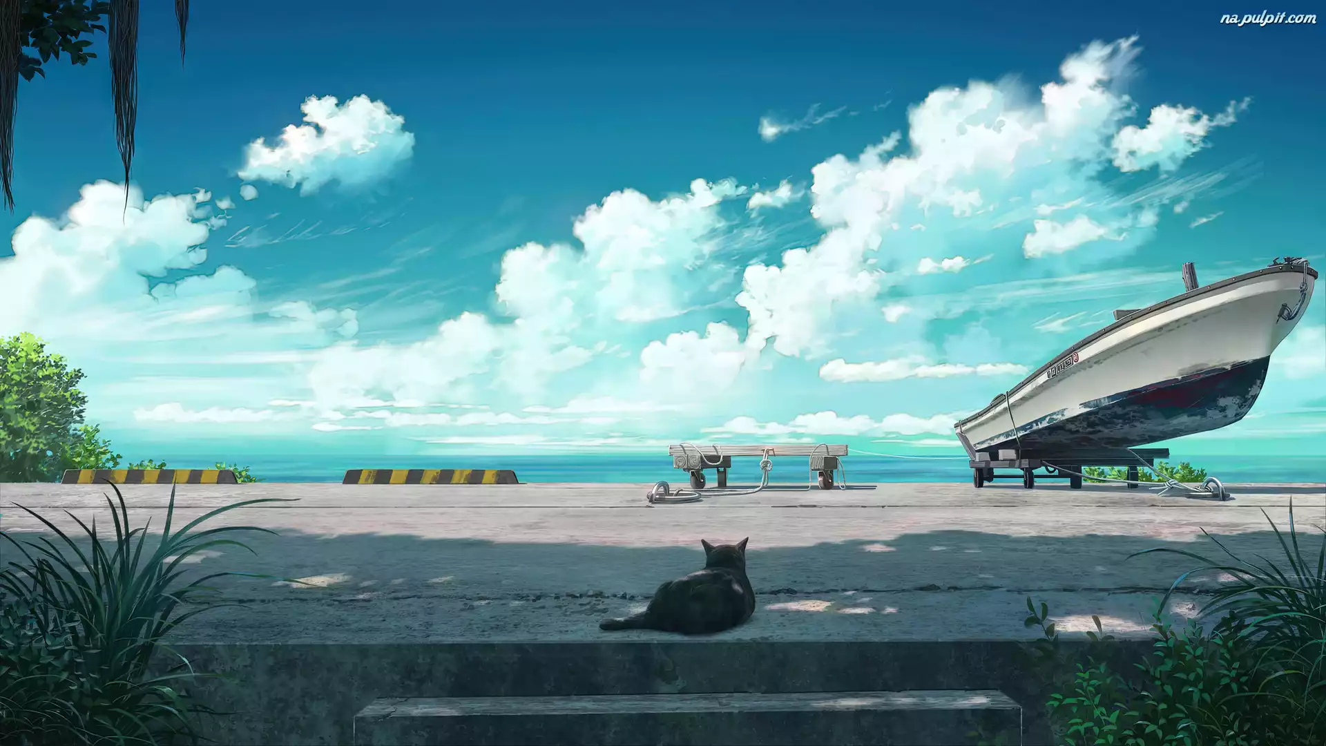 Łódka, Niebo, Chmury, Nabrzeże, Kot Na Pulpit