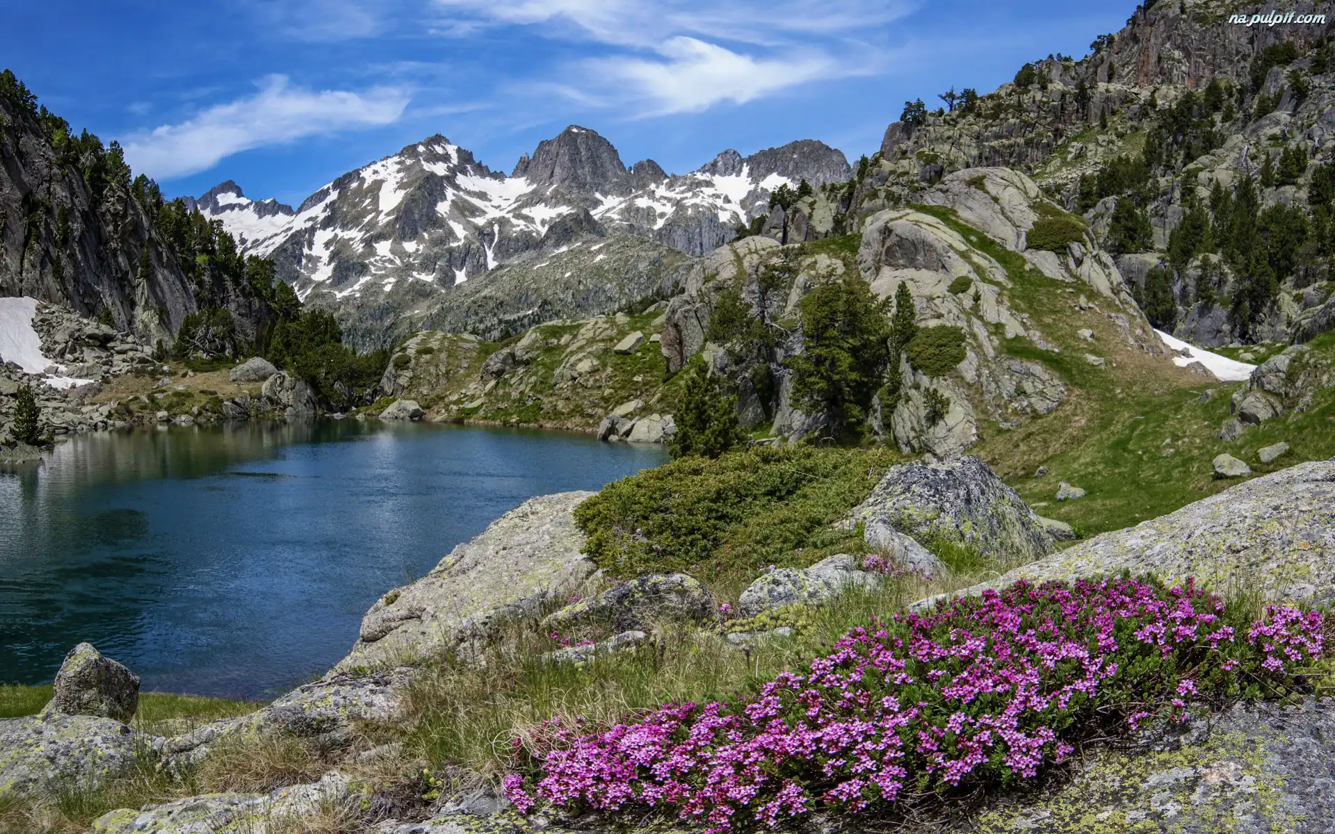 Park Narodowy de Aiguestortes i Estany de Sant Maurici, Hiszpania, Trawa, Skały, Drzewa, Katalonia, Pireneje, Góry, Niebo, Jezioro, Kwiaty Na Pulpit |