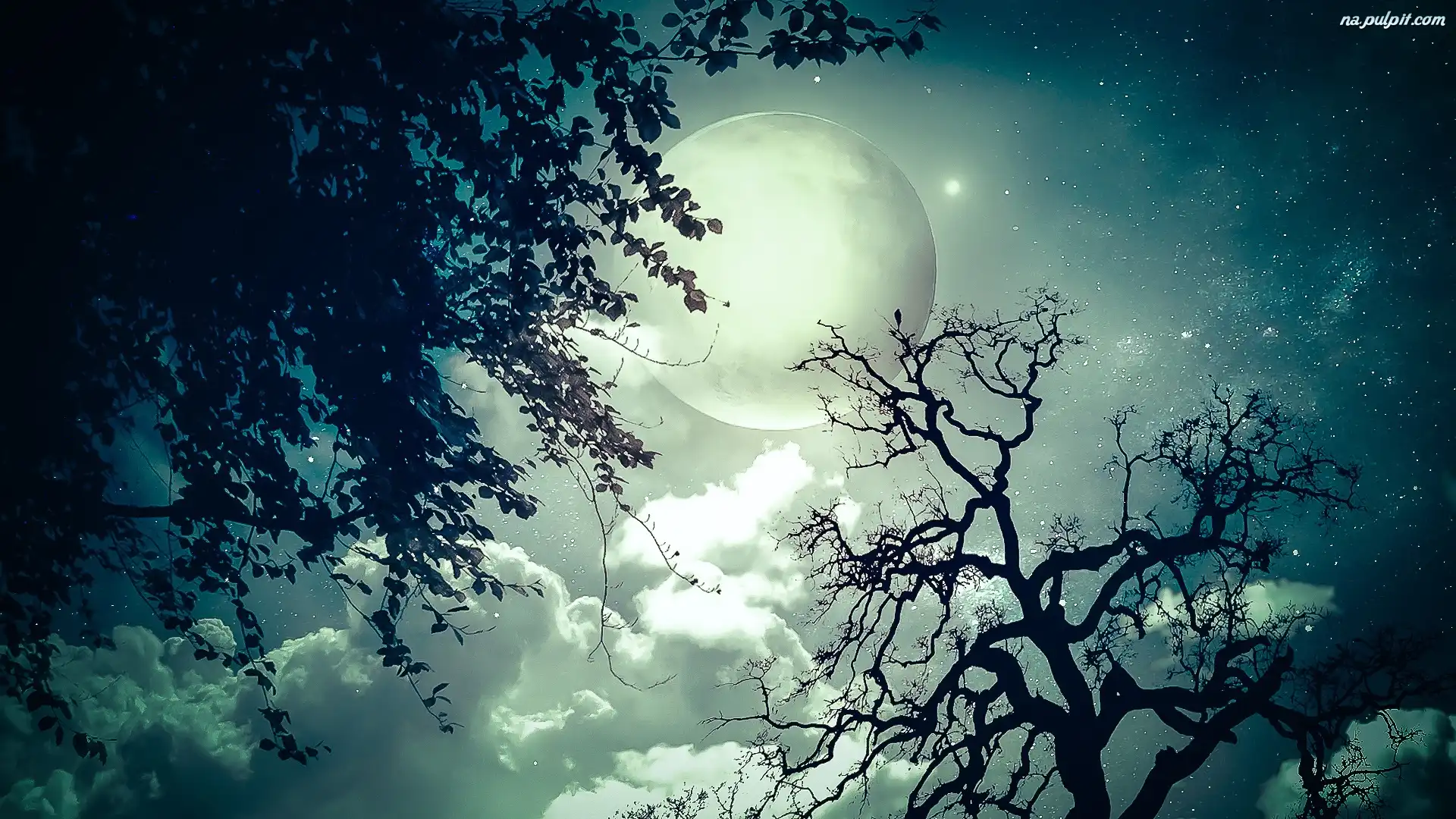 Niebo, Księżyc, Drzewa, Chmury Na Pulpit