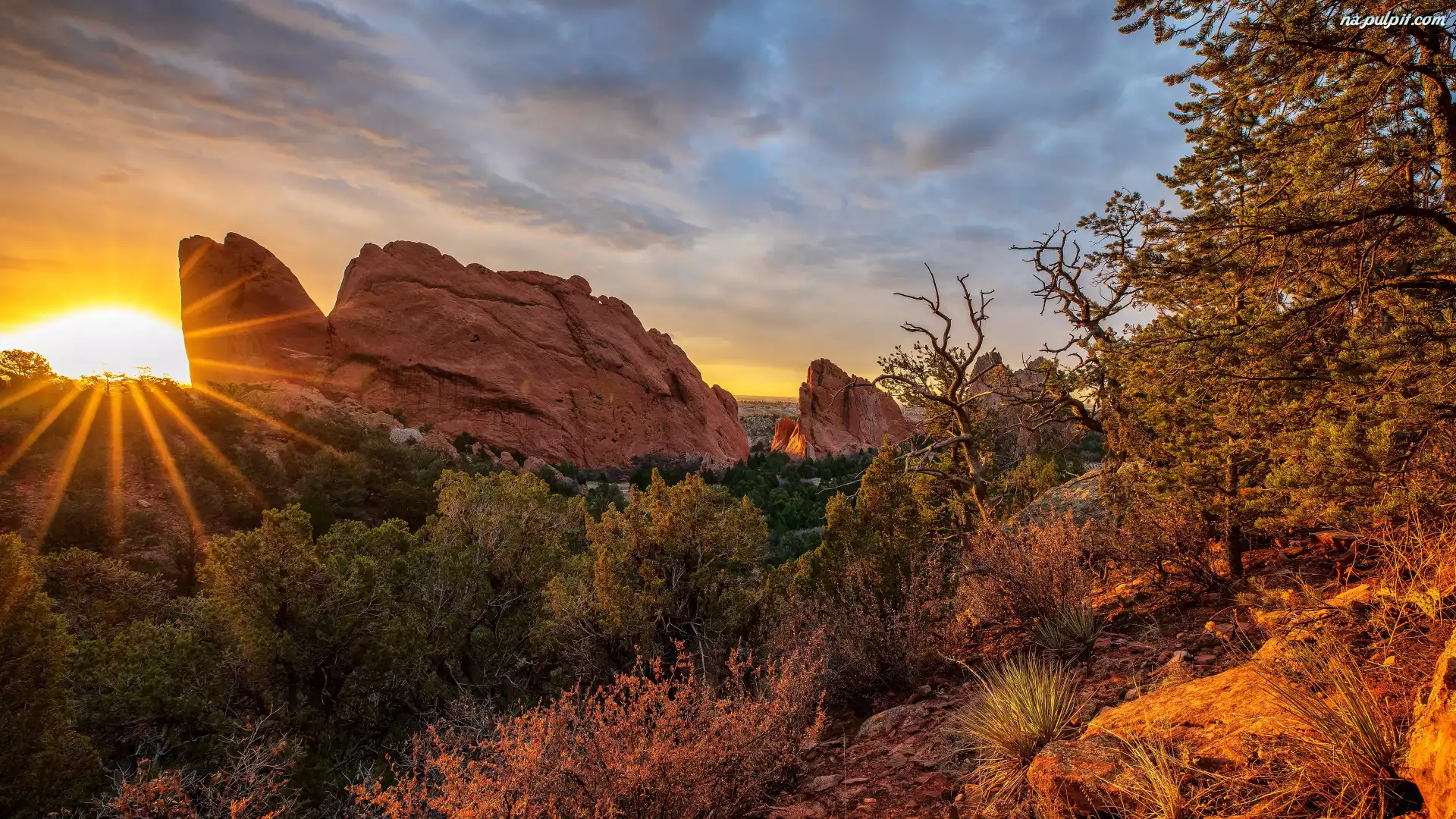 Promienie słońca, Drzewa, Jesień, Góry, Skały, Roślinność, Niebo Na Pulpit