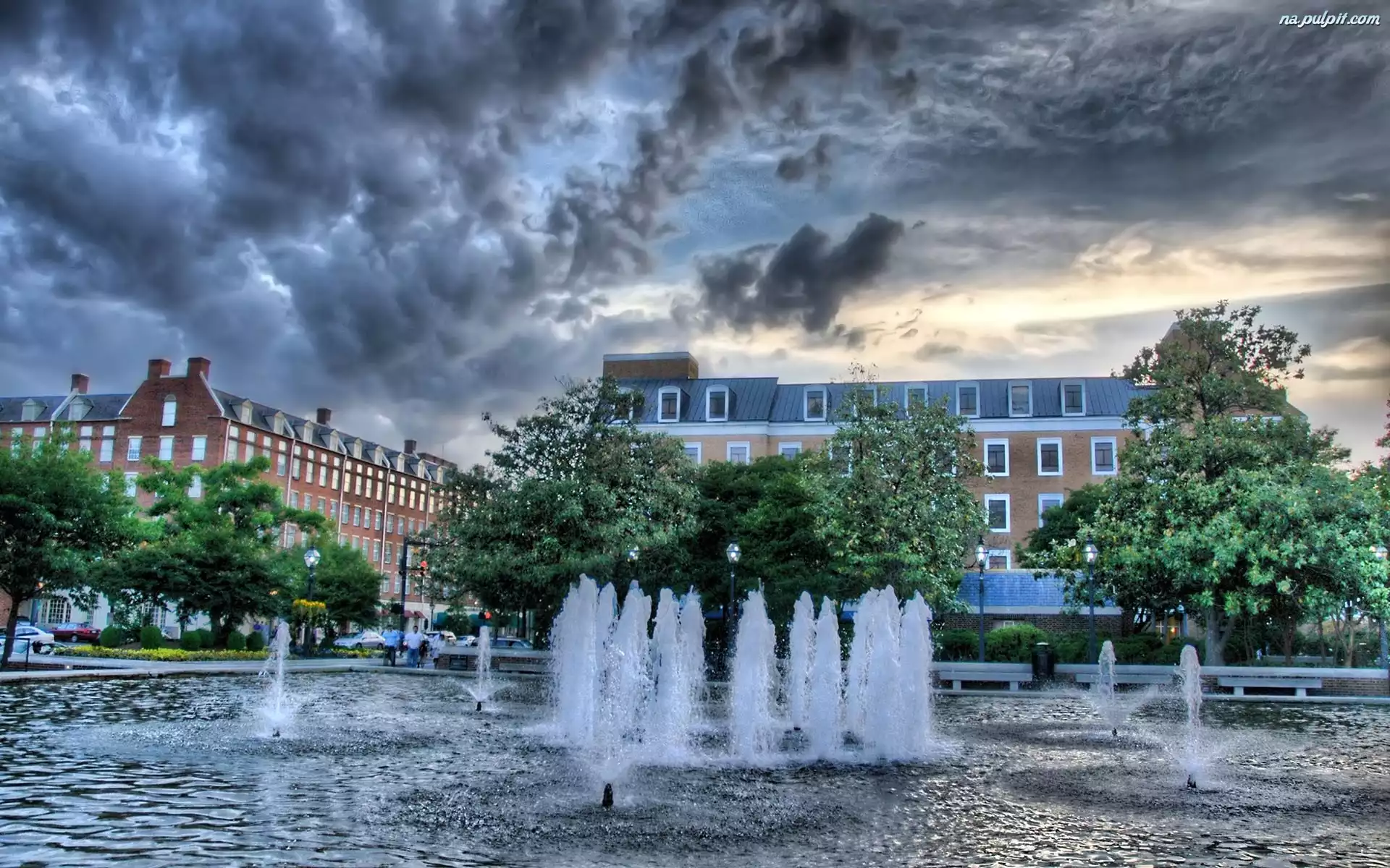 Niebo, Budynki, Fontanna, Drzewa Na Pulpit