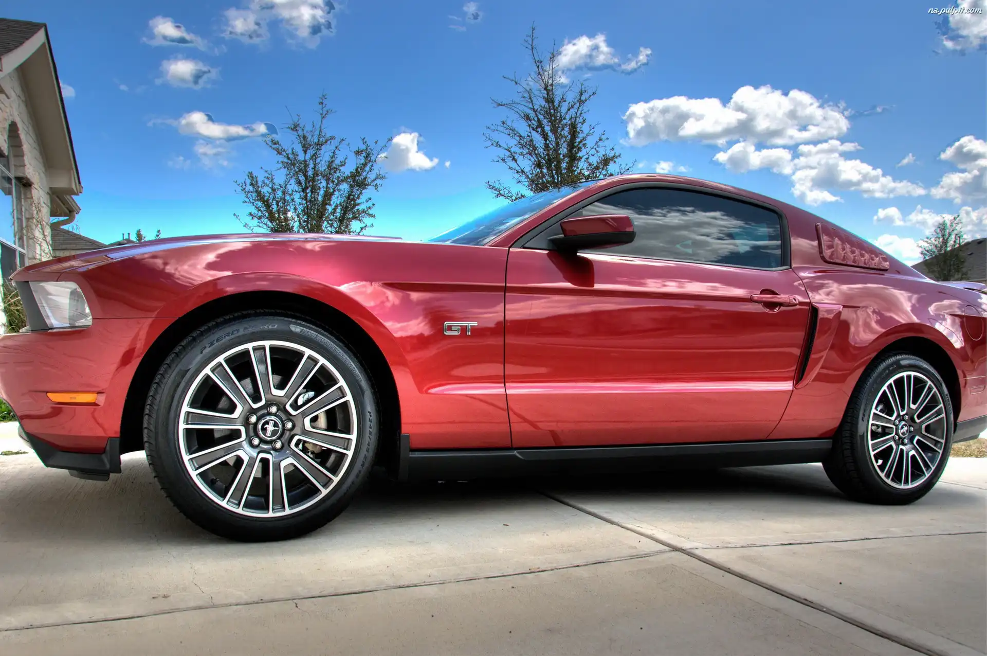 Ford, Niebo, Chmury, Mustang GT, Czerwony, Plac Na Pulpit