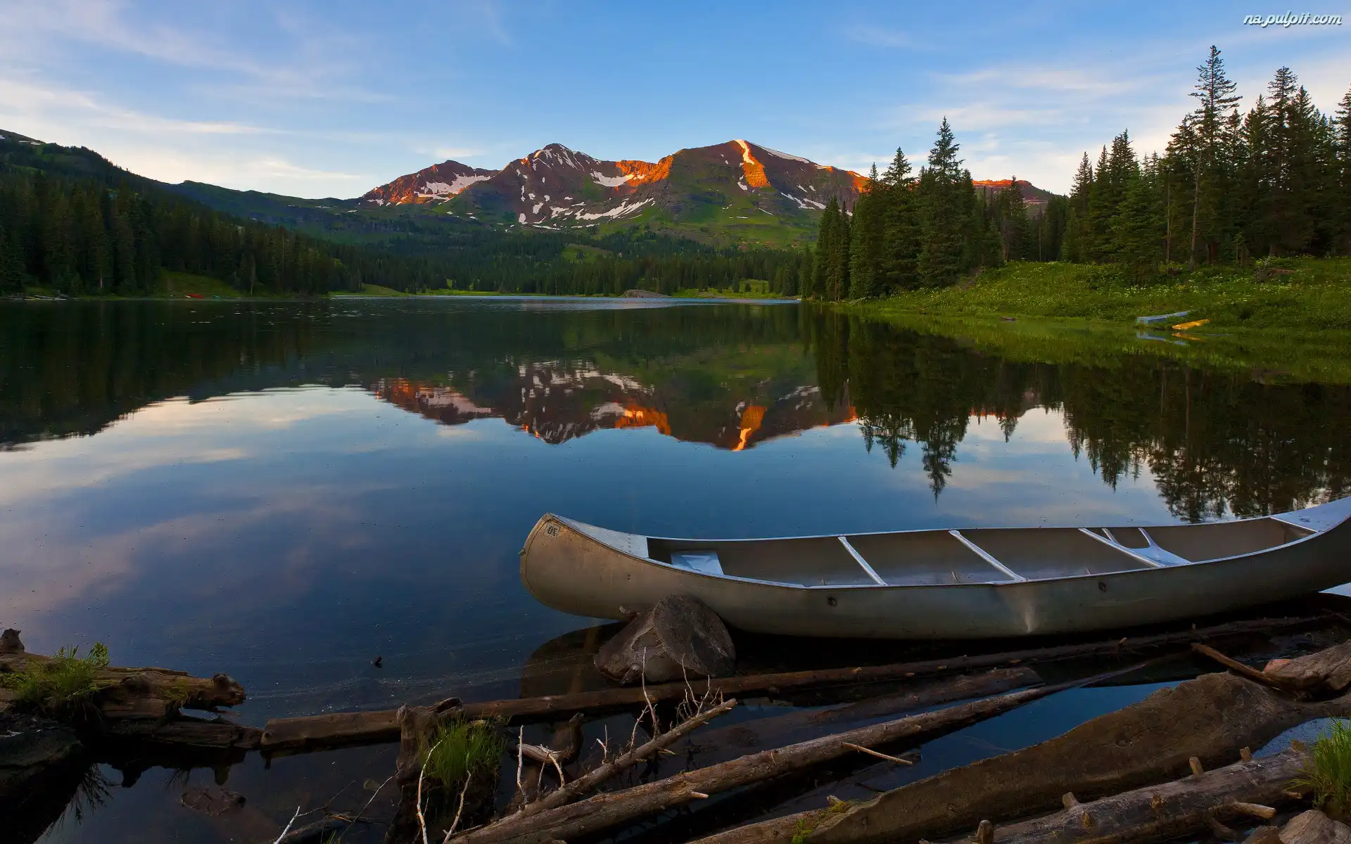 Brzeg, Drzewa, Góry, Jezioro, Łódka, Kłody, Odbicie, Las, Niebo Na Pulpit