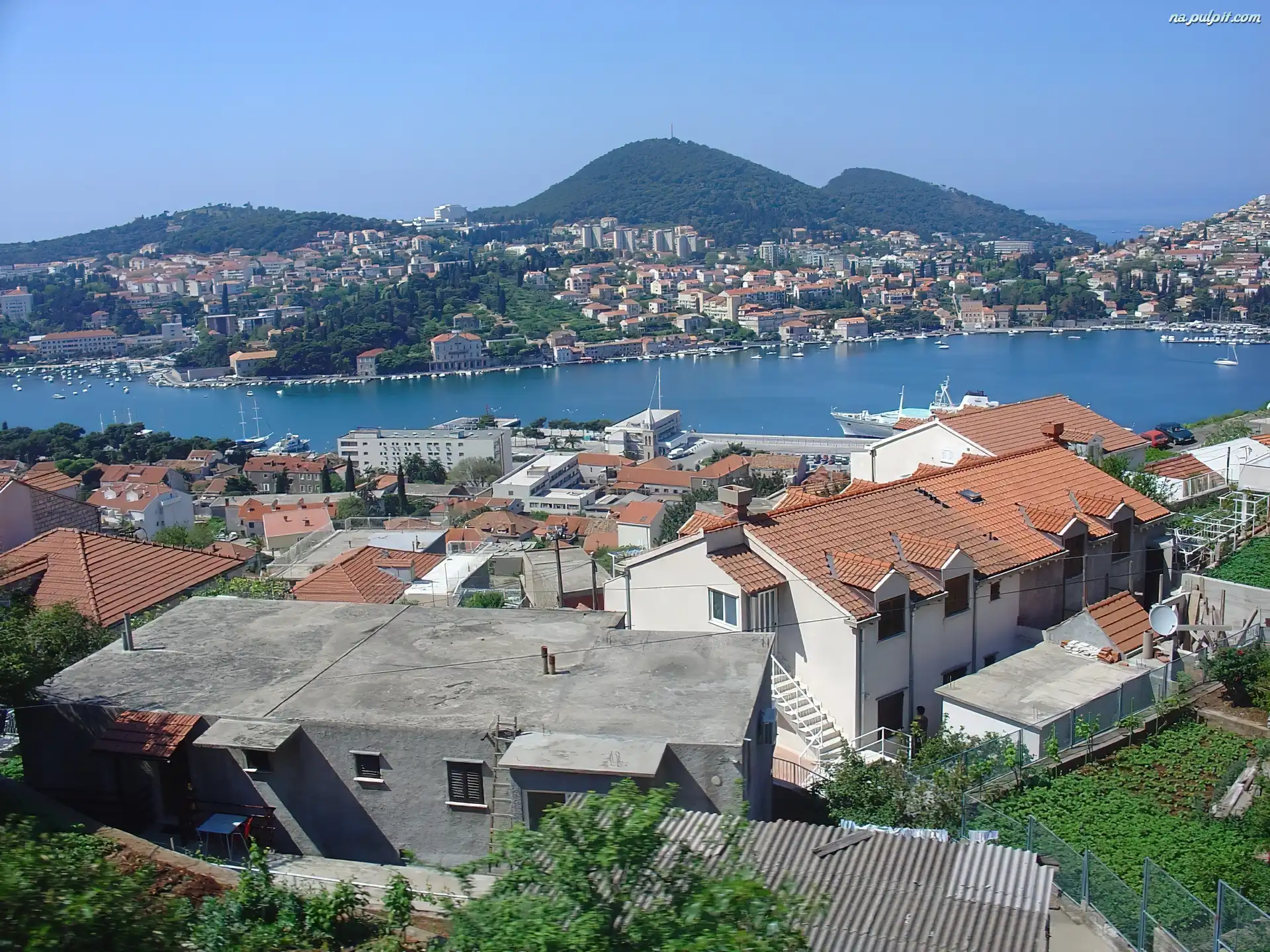 Niebo, domy , statki, Morze, Góry, dachy Na Pulpit