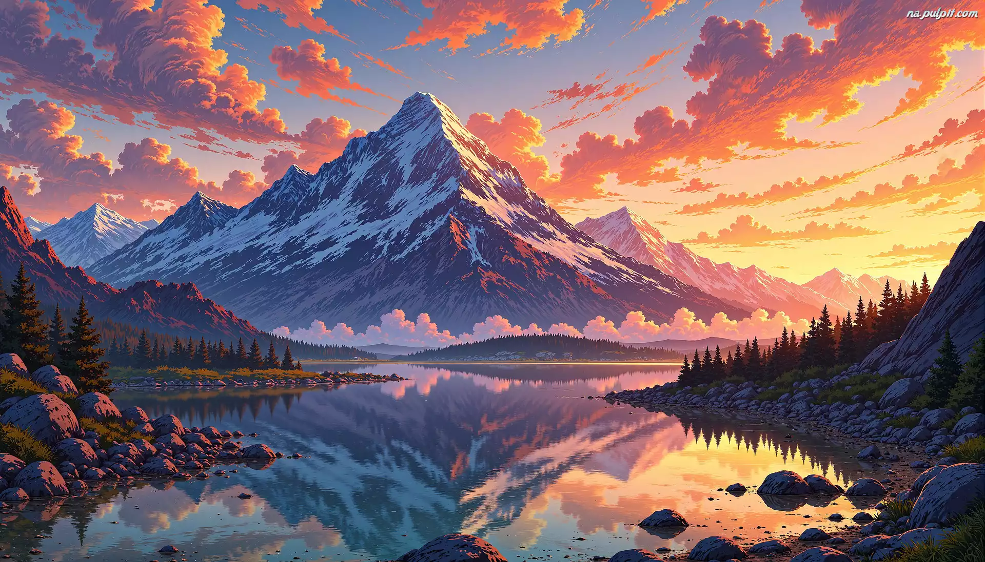 Chmury, Góry, Kolorowe, Niebo, Jezioro, Grafika