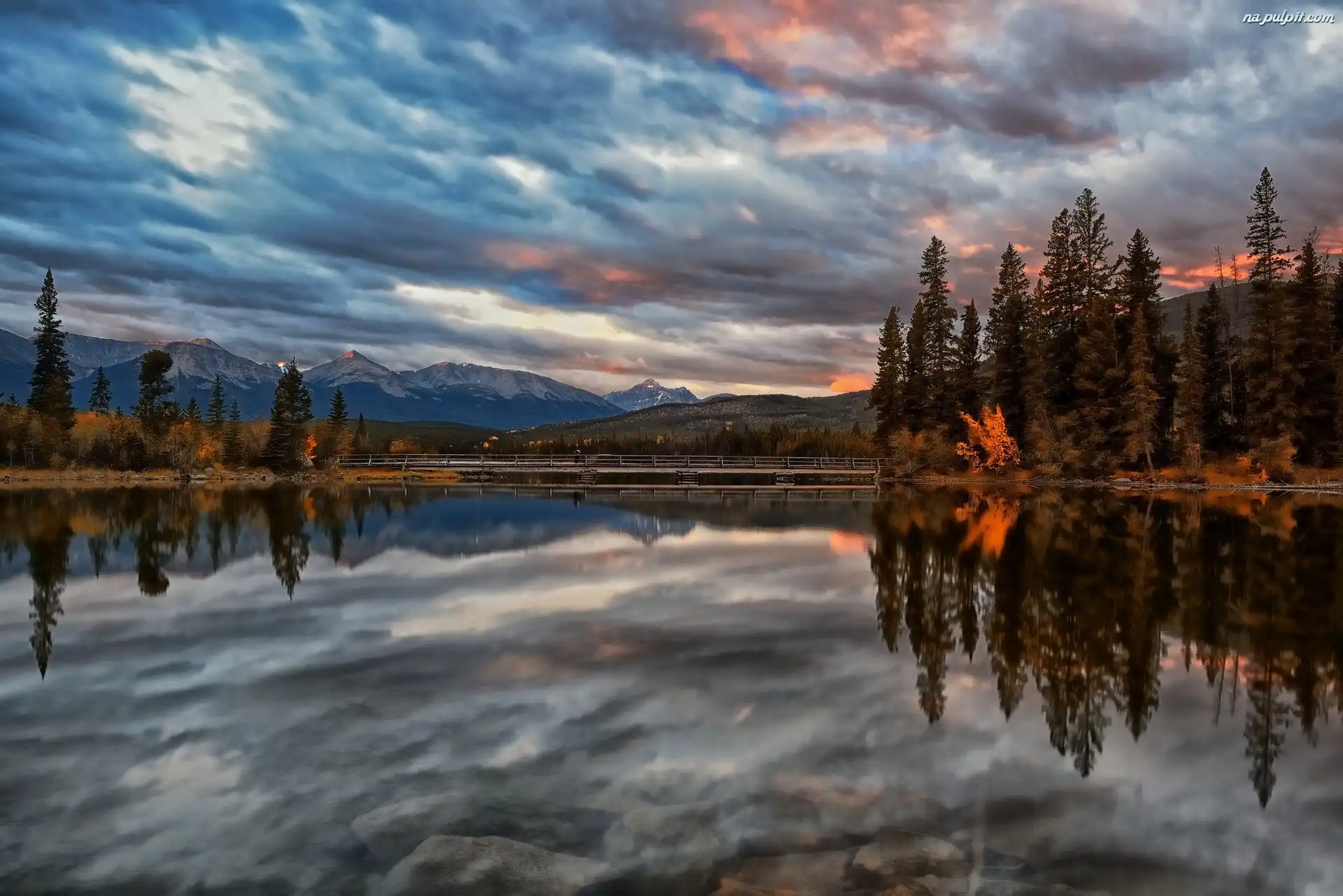 Niebo, Góry, Drzewa, Jezioro, Zachmurzone Na Pulpit