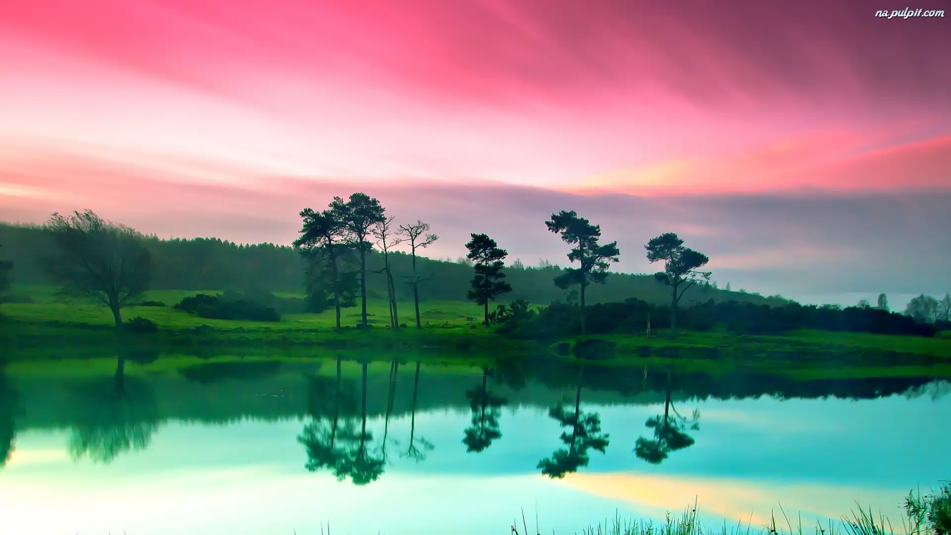 Niebo, Drzewa, Odbicie, Jezioro, Różowe Na Pulpit