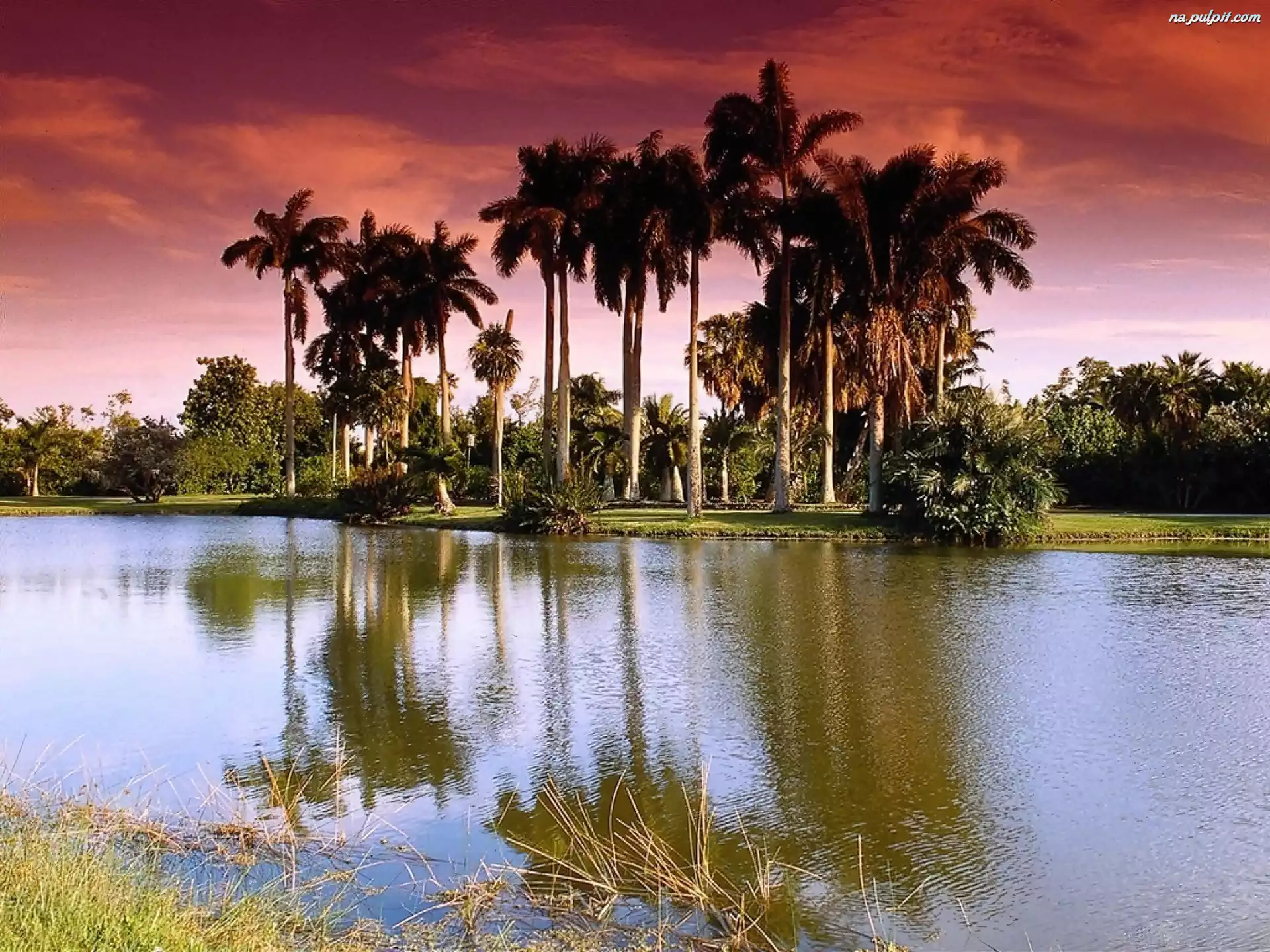 Niebo, Palmy, Jezioro, Czerwone Na Pulpit
