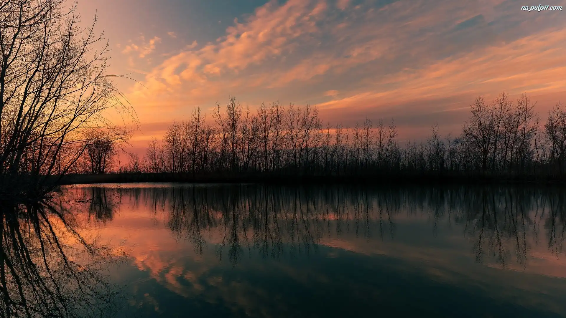 Drzewa, Zachód słońca, Niebo, Odbicie, Jezioro Na Pulpit