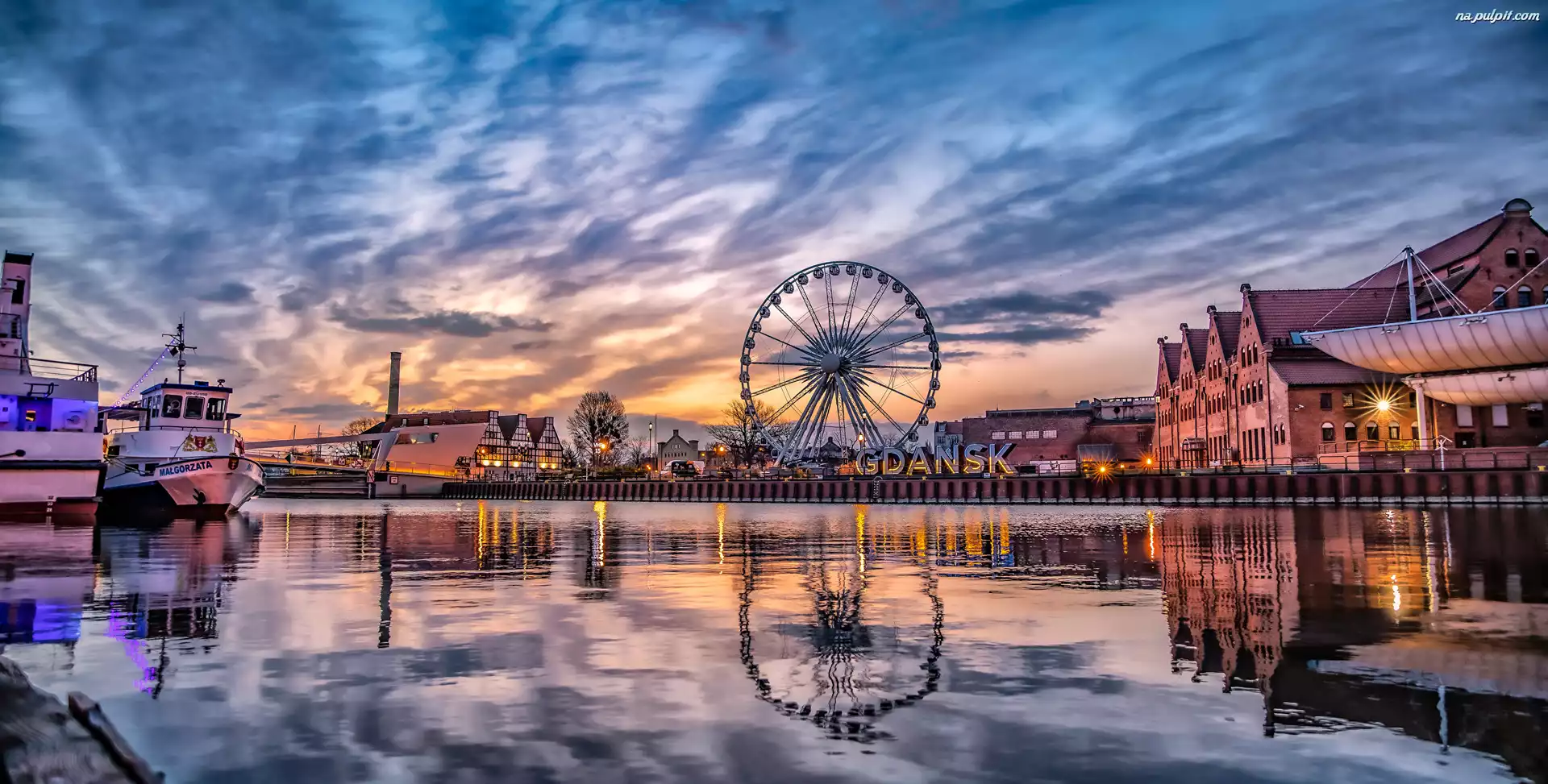 Niebo, Statek, Domy, Polska, Gdańsk, Rzeka Motława, Diabelski młyn Na Pulpit