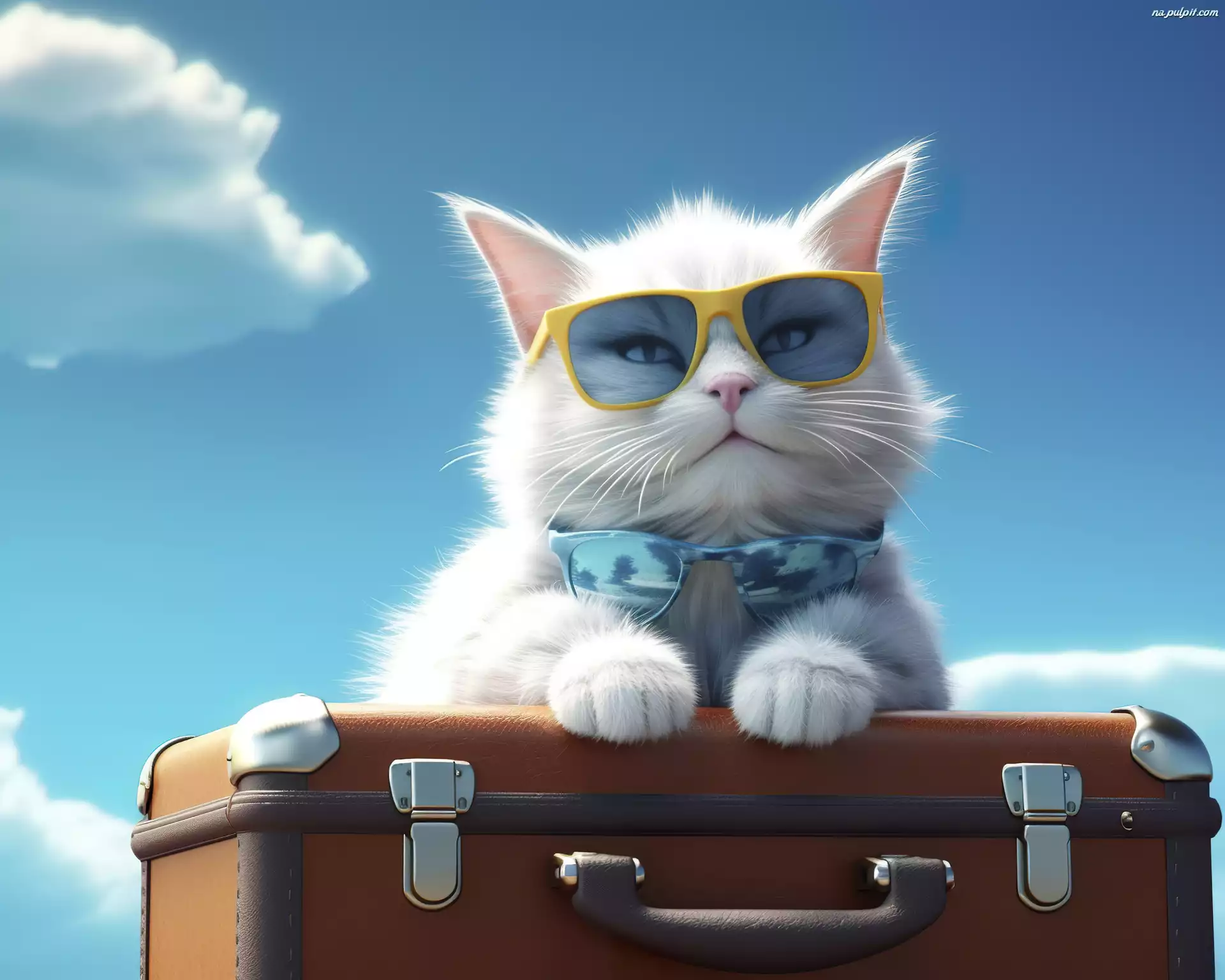 2D, Walizka, Okulary przeciwsłoneczne, Puszysty, Biały, Kot, Niebo Na Pulpit