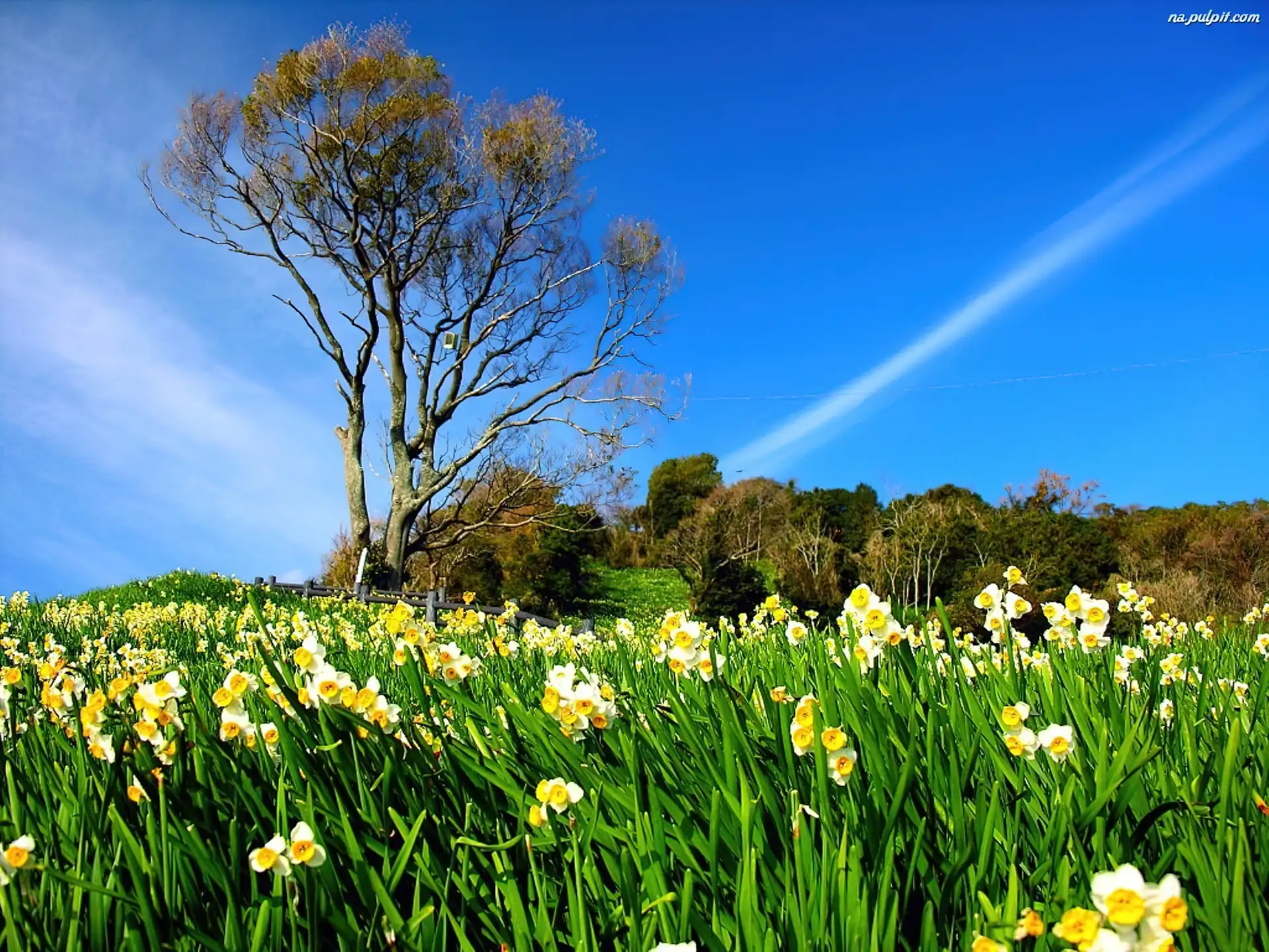 Niebo, Kwiaty, Żółte, Drzewa Na Pulpit