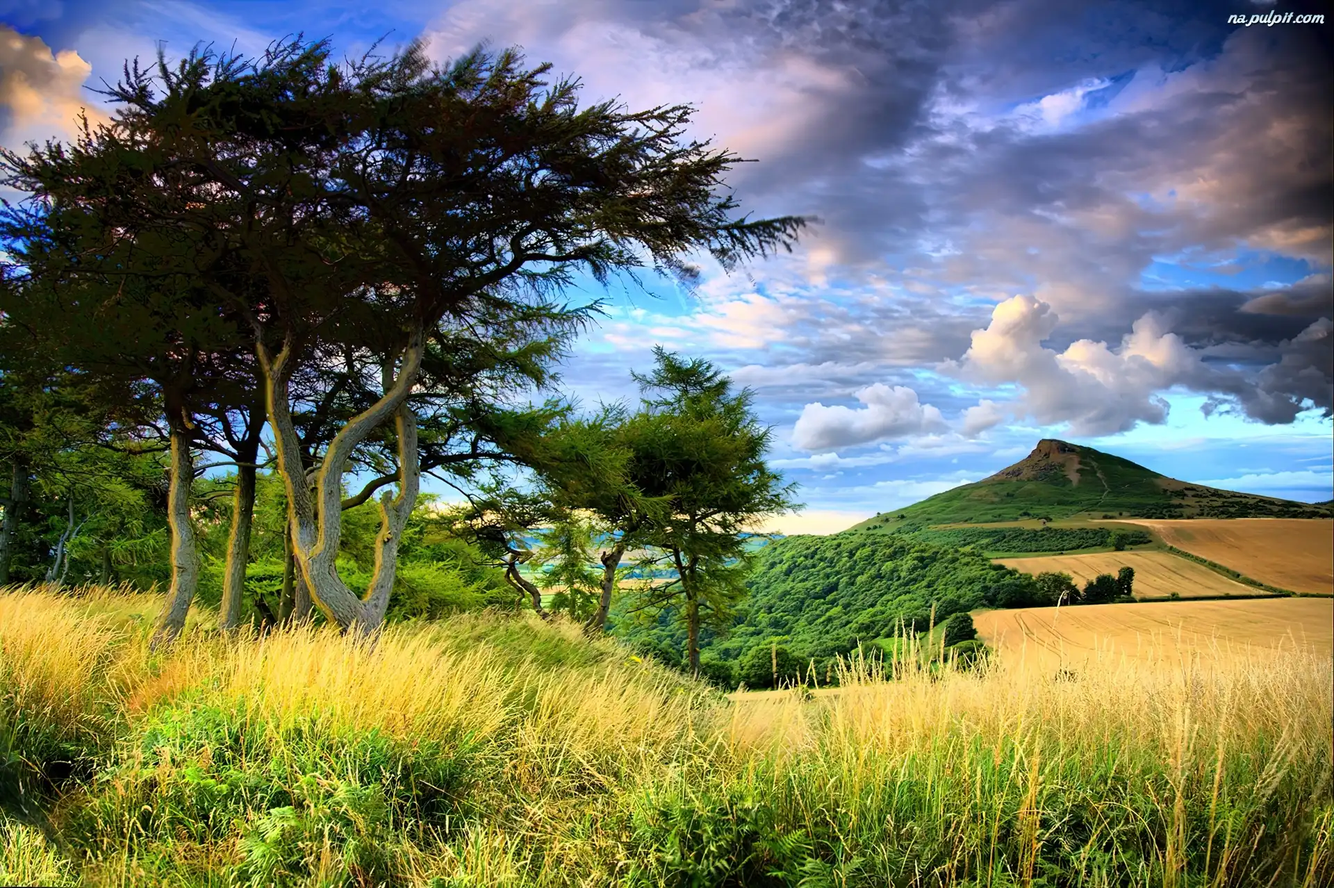 Niebo, Trawy, Drzewa, Pola, Góra Na Pulpit