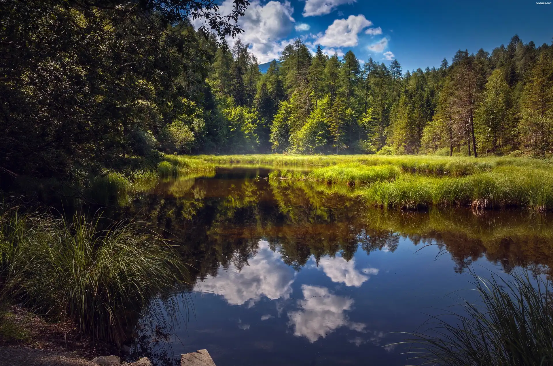Niebo, Staw, Poranek, Las